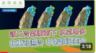 農業氣象 115/01/19 週二冷氣團南下,水氣增多,北東部濕冷,中南部溫差大 臺中市政府農業局 2024-10-14 週二冷氣團南下,水氣增多。 北東部濕冷,中南部溫差大。 西部夜晚清晨有低溫情形。 沿海風浪增強,漁業多留意。