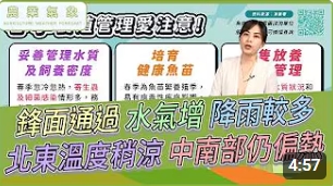 農業氣象 115/04/17 週五六鋒面過,水氣增、降雨較多,北東部溫度稍轉涼,中南部仍偏熱 臺中市政府農業局 2024-10-14 【 週五至週日鋒面接近與影響 降雨機會增加 🌧️ 】 #農業氣象 115/04/17 https://youtu.be/PFRKPEz70HM?si=wzTMPHxEA_aHg9BW 📍 4/17(五)| 鋒面逐漸接近· 鋒面前緣西南風環境,高溫炎熱,各地有30度以上機會· 桃園以北、宜花有局部短暫陣雨 📍 4/18(六)~ 4/19(日)| 鋒面通過+東北季風增強· 中部以北、東半部、恆春...