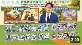 【 週二天氣穩定,週三四鋒面再度報到 】 #農業氣象 115/04/28 臺中市政府農業局 2024-10-14 https://youtu.be/5ofOiIXAXEw?si=Hit_KwdhDDx6NVXz 📍 4/28(二)| 偏東風環境,日夜溫差大🔹 西半部:多雲到晴,午後山區有局部短暫陣雨🔹 東半部、恆春半島:有局部短暫陣雨🔸 白天偏熱,西半部 29 ~ 33°C、東半部 28 ~ 29°C🔸 早晚涼,各地 20 ~ 23°C 📍 4/29(三)~ 4/30(四)| 鋒面報到+東北季風報...