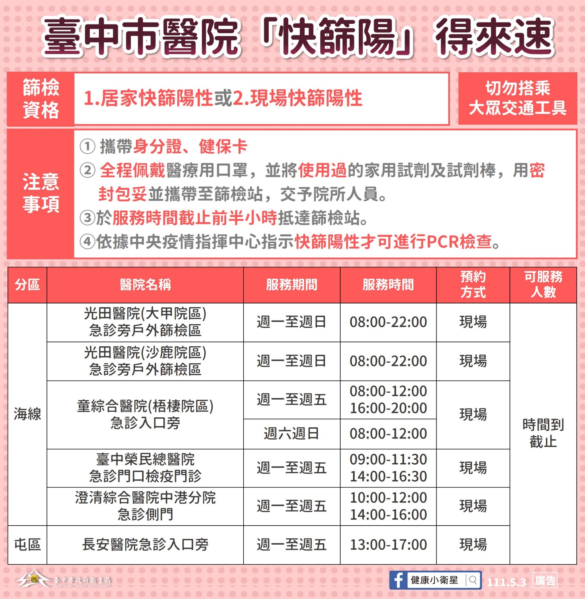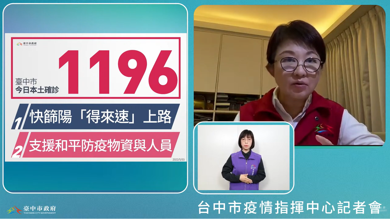 全國今(3)日本土確診新增2萬3102例,台中市本土個案新增1196例,其中有495位確診個案為接觸者發病,包含校園群聚124例、職場群聚101例、家庭朋友群聚270例;市長盧秀燕今日持續透過遠端視訊主持防疫記者會,她指出,有鑒於確診數越來越多,民眾篩檢需求大增,台中與各大醫院合作實施「快篩陽得來速」機制,目前已有6家醫院開設「綠色通道」安排醫師看診,當下就能領藥、衛教及繳費,大幅節省就醫時間。