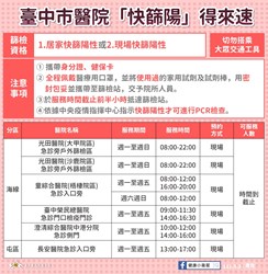 衛生局長曾梓展說明,所謂「快篩陽得來速」並不是不用下車,而是指快篩陽性或有PCR採檢或就醫需求的民眾不必進到醫院,可優先獲得診療。台中市今日就有6家醫院開設「快篩陽」綠色通道,包括台中榮總、澄清醫院中港院區、童綜合醫院、光田醫院沙鹿院區、光田醫院大甲院區、長安醫院,明後天還會再增加醫院擴充量能。
