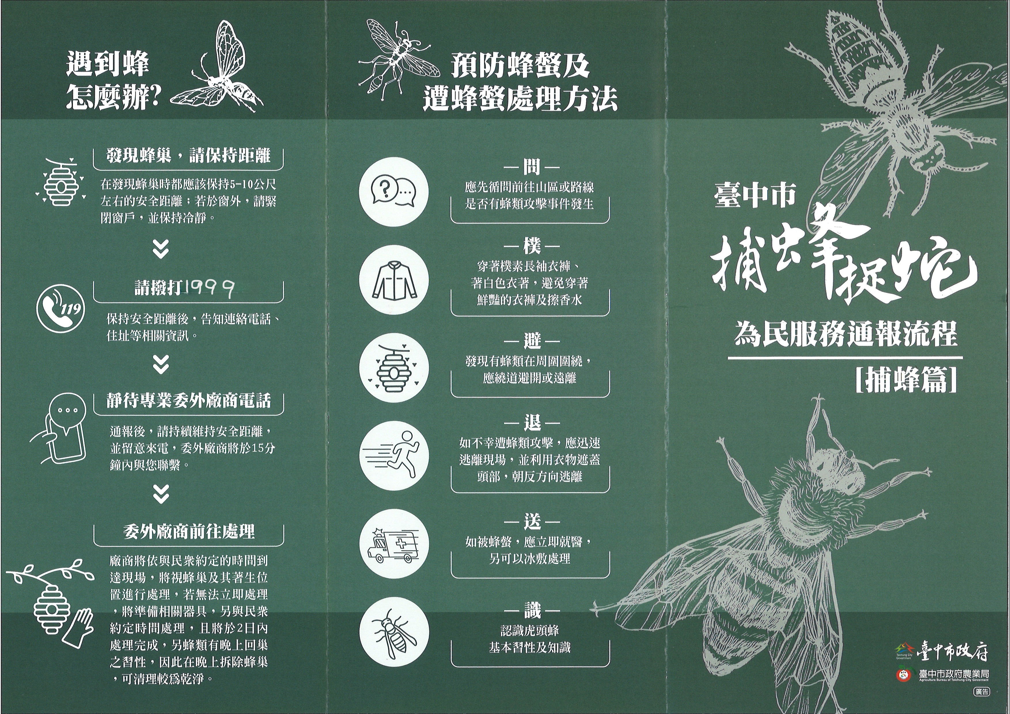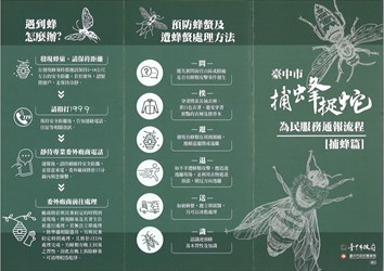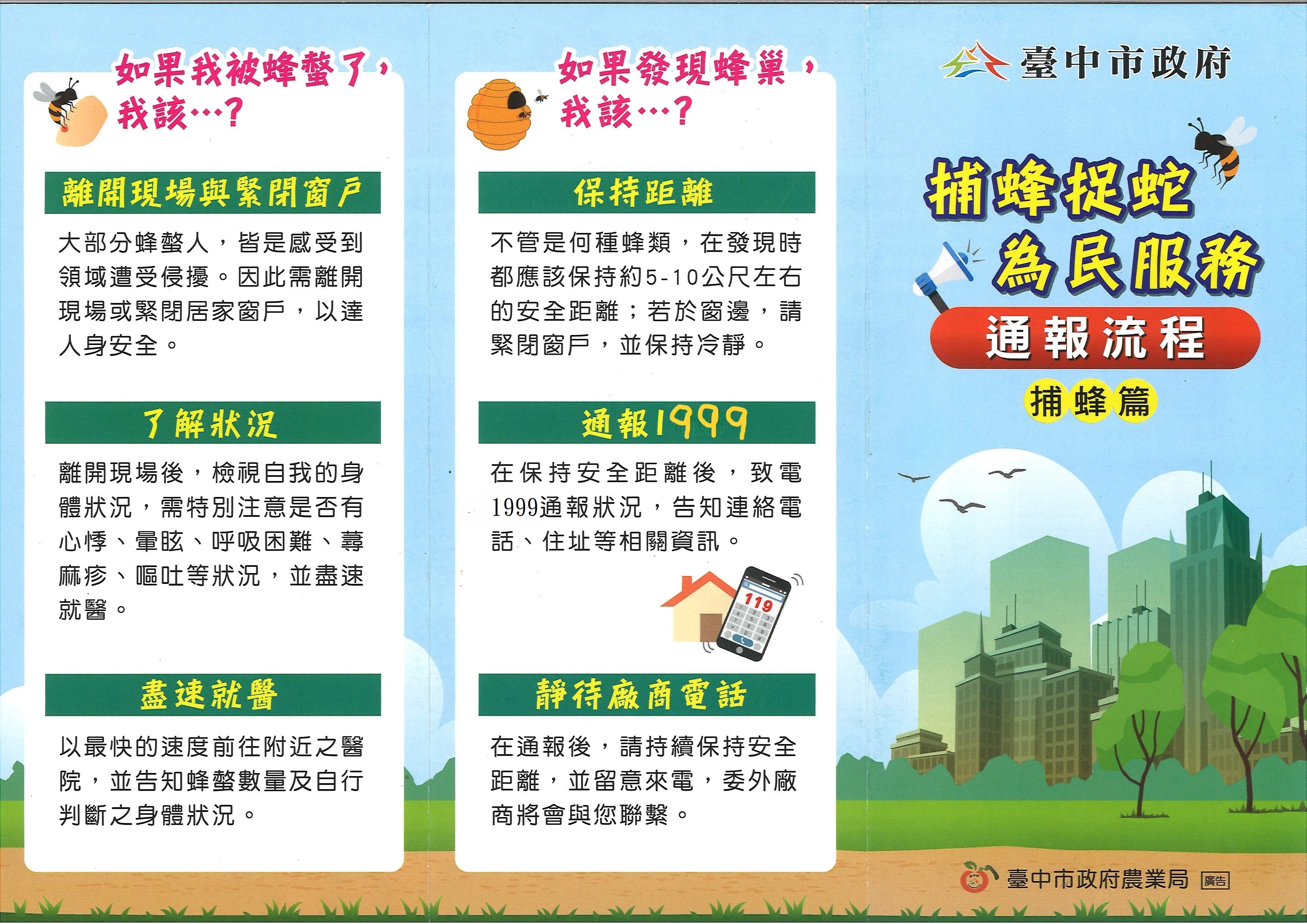 捕蜂捉蛇為民服務通報程序:發現蜂蛇入侵民宅、社區、學校及公園,請立即撥打1999專線,將轉接至臺中市政府消防局錄案,並將由委外廠商前往處理,如有蜂螫蛇咬等緊急情況,則請盡速撥打119,以爭取時效保障健康安全。