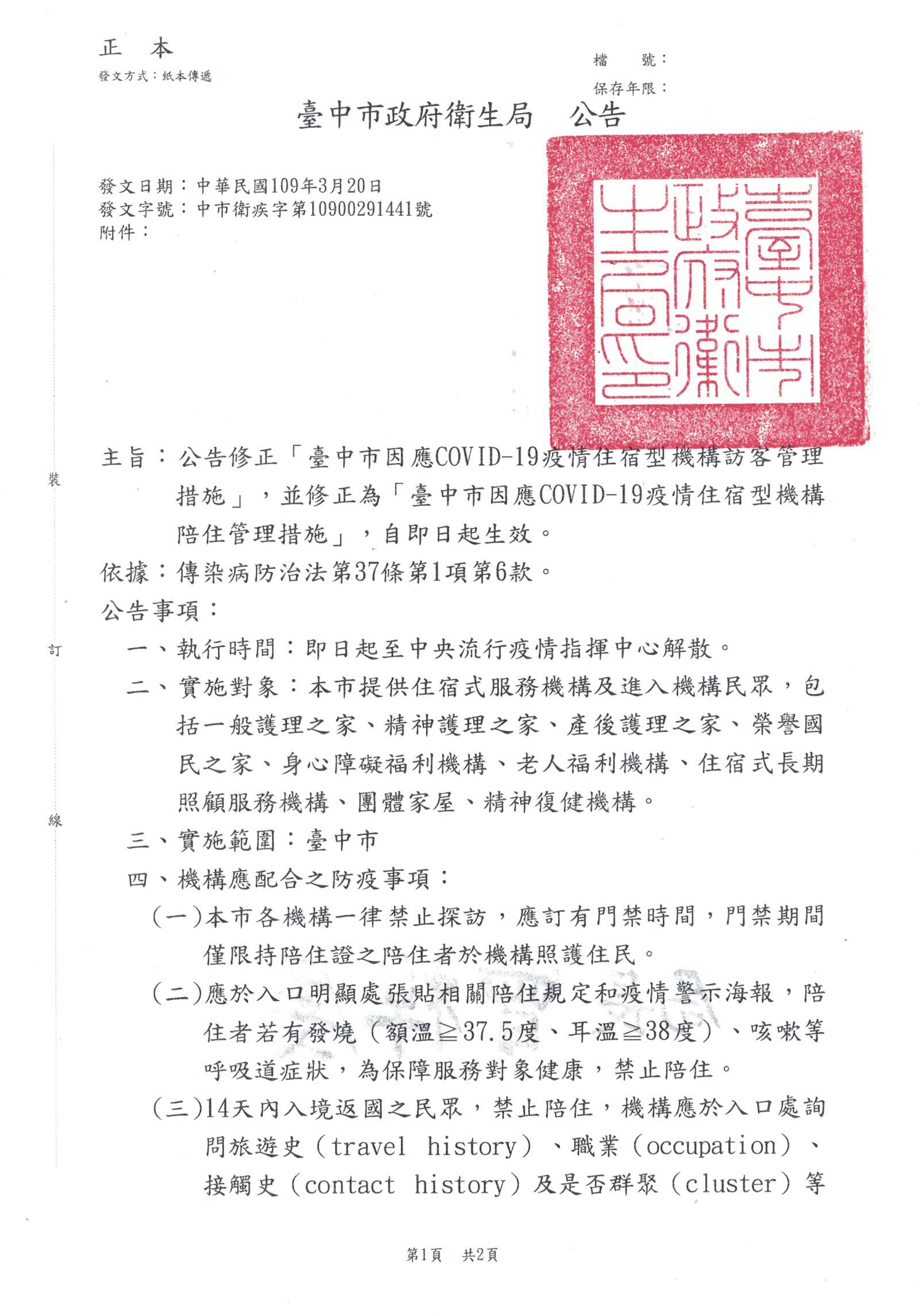 市府衛生局今日公告修正「台中市因應COVID-19疫情醫院陪探病管理措施」及「台中市因應COVID-19疫情住宿型機構陪住管理措施」,醫院及住宿型機構(如一般護理之家、精神護理之家、老人福利機構、身心障礙機構等)全面禁止探病,民眾可多利用視訊或其他方式關心住院或機構內的親友。