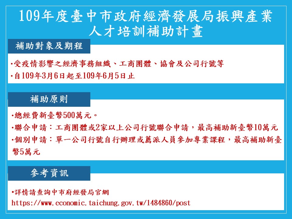 市府經發局表示,市府提列經費500萬元,推出「振興產業人才培訓補助計畫」,鼓勵台中受疫情影響的工商團體及公司行號進行員工培力訓練,適用對象為受疫情影響的工商團體、公司行號等。