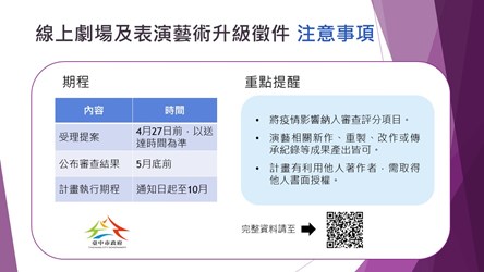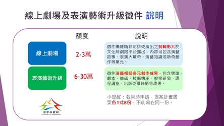 文化局表示,「線上劇場」徵選總長度20分鐘以上的團隊彩排或演出剪輯影片,包含演藝故事、表演大驚奇、演藝知識分享或新奇創作等不同單元,並公布在台中文化小尖兵臉書粉絲專頁(https://bit.ly/3aqAfC2)及文化局youtube(https://bit.ly/3bB1FW5);「表演藝術升級計畫」鼓勵多元創作,可以樂譜創作、劇本編寫、舞碼創作、技藝傳承、教案研發、講座課程、研習課程、出版或攝錄影等執行計畫參加,獲選團體每團最高可獲補助30萬元。