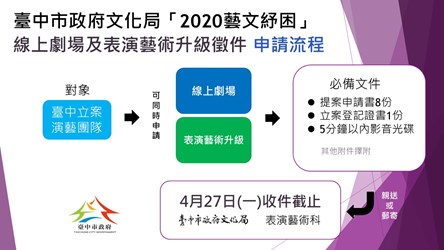 因新冠肺炎疫情影響藝文活動,台中市政府文化局擬定「藝文紓困3+2」,包括場地費用全額退還、放寬受補助演出辦理期限、提早撥補助款,也推出「線上劇場」、「表演藝術升級計畫」徵選,民眾在家就能欣賞精彩表演,也協助藝文團隊度過難關,即日起開始徵件至427日,歡迎藝文團隊踴躍參與。