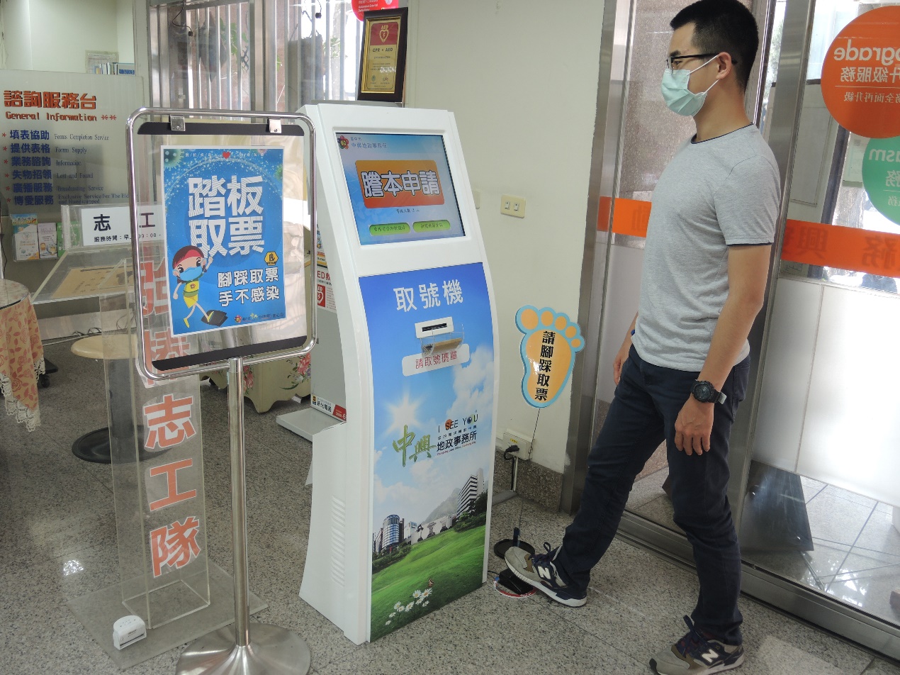 因應新冠肺炎疫情,台中市中興地政事務自行研發取號機腳踏功能,以腳踩踏板方式取號,提供民眾「腳來速」取票服務,減少手部接觸,中興地所並每日進行各區域清潔消毒,希望讓民眾安心洽公。
