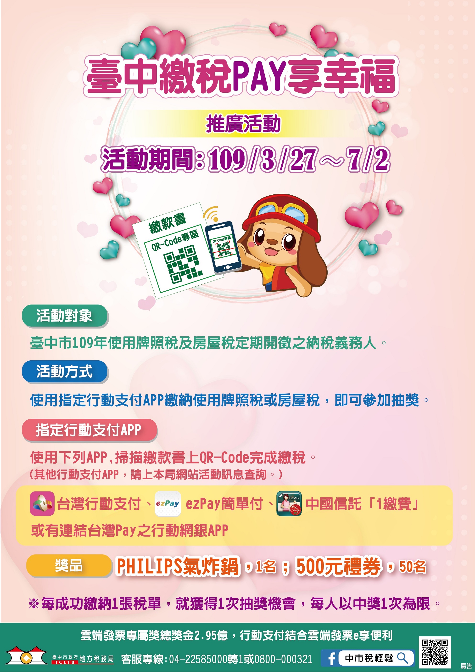 地方稅務局表示,為鼓勵市民透過行動支付繳稅,推出「台中繳稅PAY享幸福」活動,只要透過指定行動支付繳稅APP「台灣行動支付」、「ezPay簡單付」、中國信託「i繳費」APP或有介接「台灣Pay」的行動網銀APP繳納使用牌照稅或房屋稅,即可獲得抽獎資格,獎項有氣炸鍋1名及500元禮券50名。