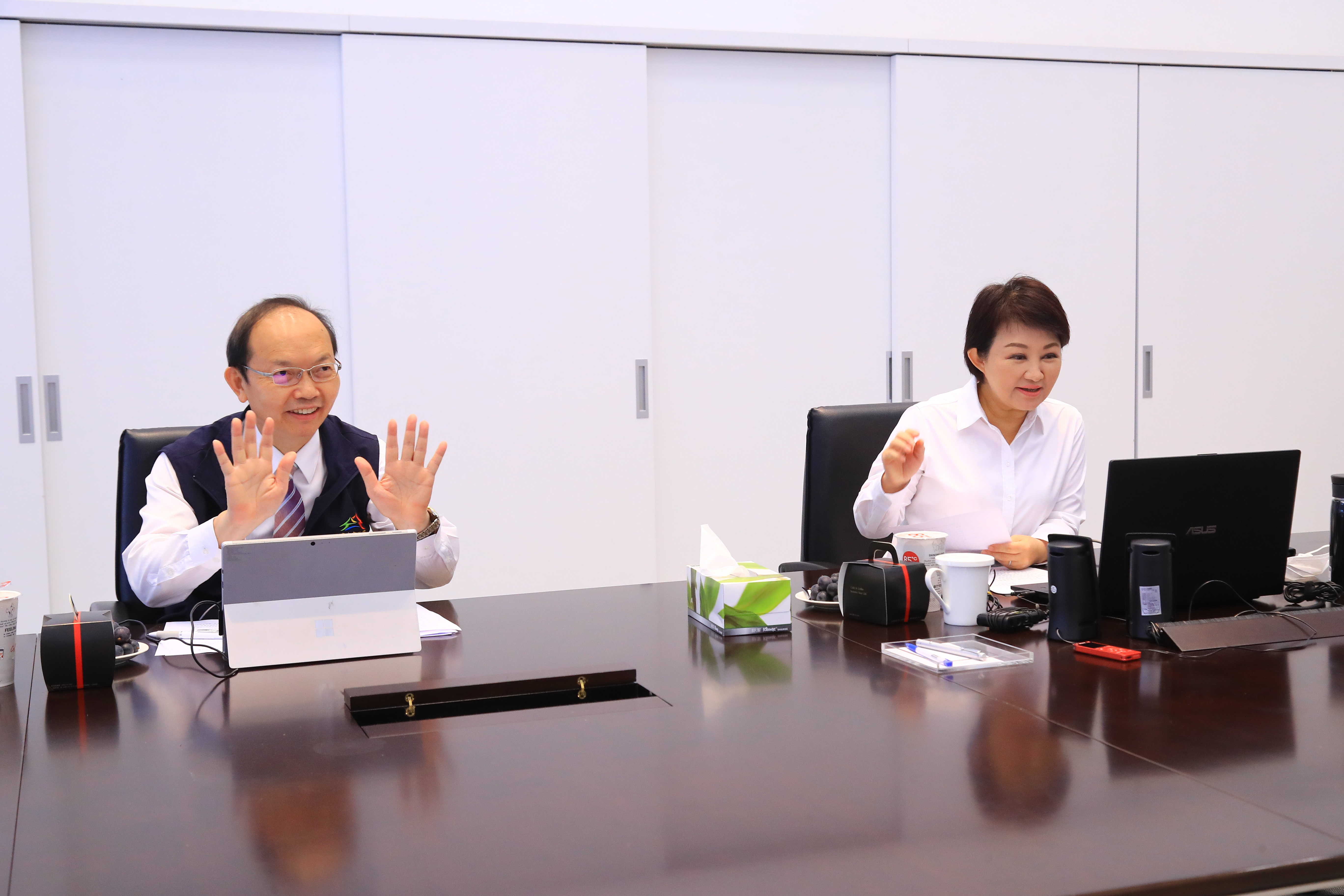 正值新冠肺炎防疫期間,盧市長今日改以遠端視訊方式獎勵學童,並逐一唱名肯定師生,學童們在螢幕前享用飲料、蛋糕及水果,雀躍地與盧市長分享撿拾垃圾的感想,兩邊親切互動宛如「零距離」,學童開玩笑稱呼市長為「櫻桃小丸子」,童言無忌更讓現場歡樂無比;為宣導防疫,盧市長也化身「燕子老師」,指導學童洗手7步驟,維護孩子健康。