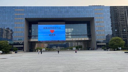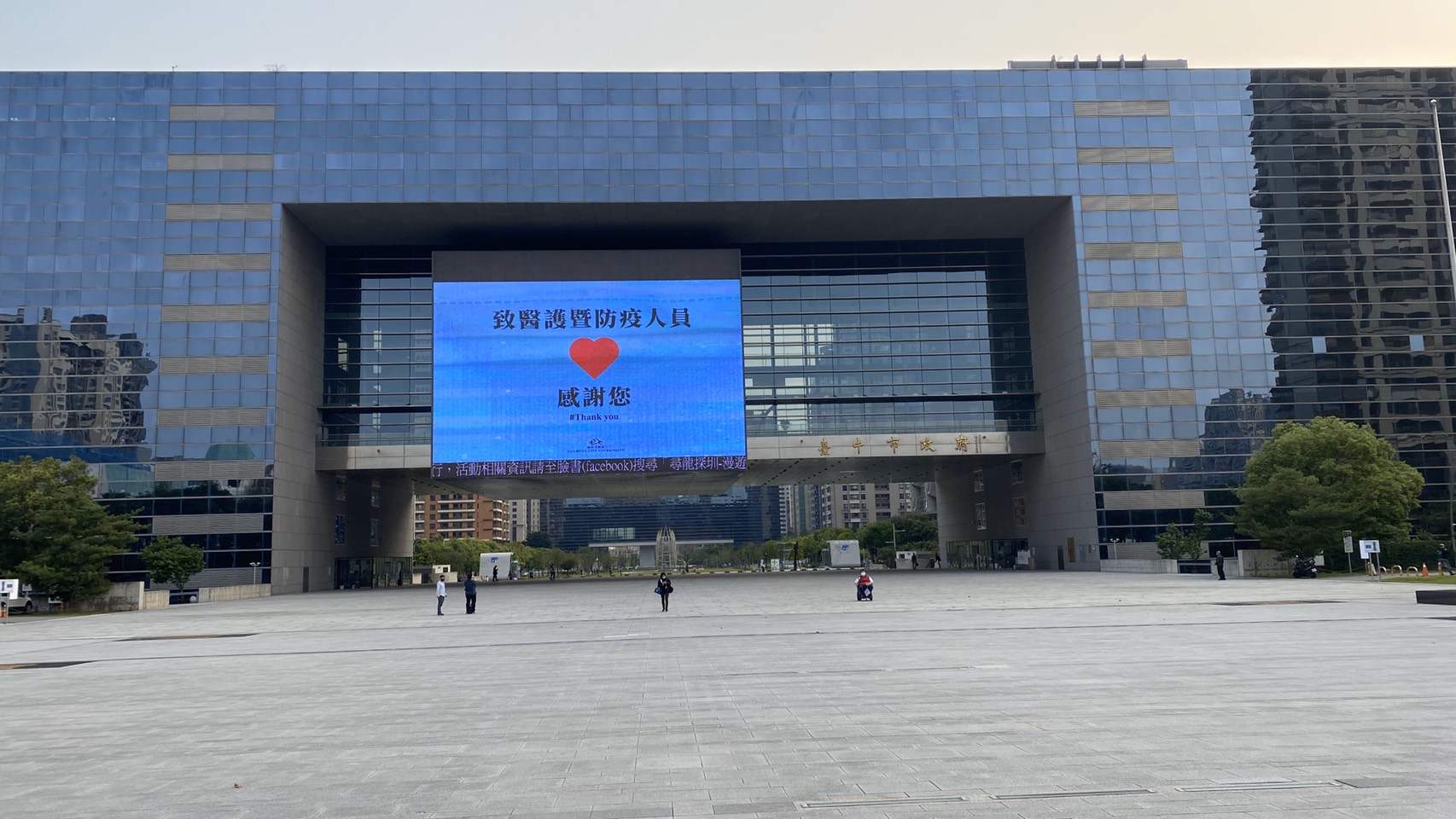 向所有辛苦的防疫人員致敬!新冠肺炎疫情嚴峻,台灣醫護及防疫人員站在第一線,守護人民健康。台中市政府自製圖卡,以象徵「口罩」的橫條紋為背景,寫上「致醫護暨防疫人員」、「感謝您」,並印上大大的「紅色愛心」,即日起於台灣大道市政大樓廣場前的大型LED電視牆播放,感謝所有防疫夥伴的無私奉獻!