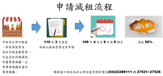 財政局說明,市府已發文通知承租戶,無論採年、半年、季、月繳方式,符合減收條件者均可檢附租金優惠申請書、市有不動產作營業使用現況照、商業登記抄本或公司登記證明文件影本、免申請登記的小規模商業證明文件或市有地上房屋課稅明細表(或房屋稅收據)影本至財政局提出申請,另已繳納全額租金者,將於以後各期應繳租金內扣扺。