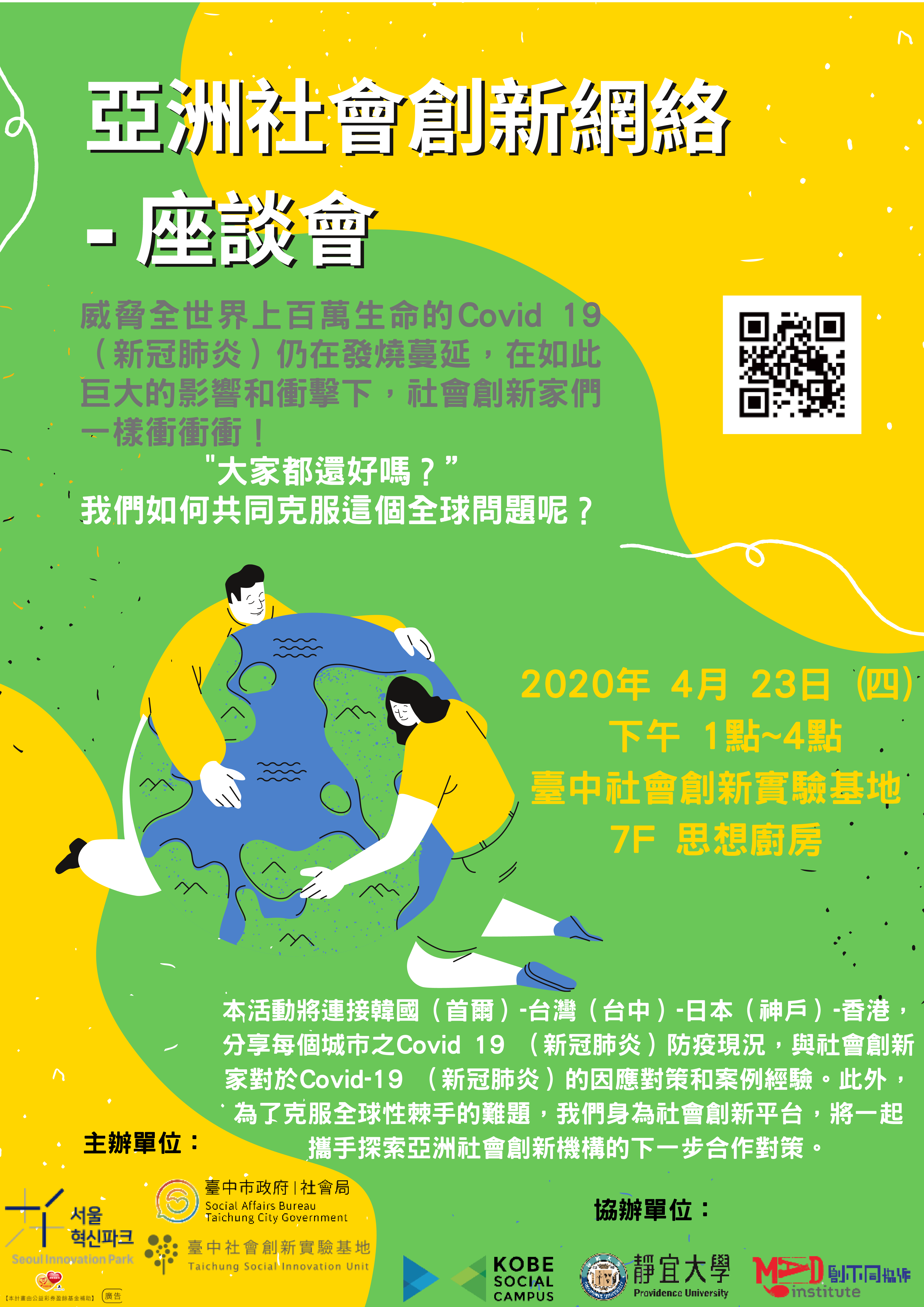 串連分享新冠肺炎防疫作為,台中、韓國首爾、日本神戶、香港四地社會創新推動中心,明(23)日下午1時將透過遠端視訊方式,分享各地社會創新中心在全球疫情衝擊挑戰下,如何提出因應措施並危機化為轉機,歡迎民眾透過直播(網址https://bit.ly/2Kul0fP )共同參與。