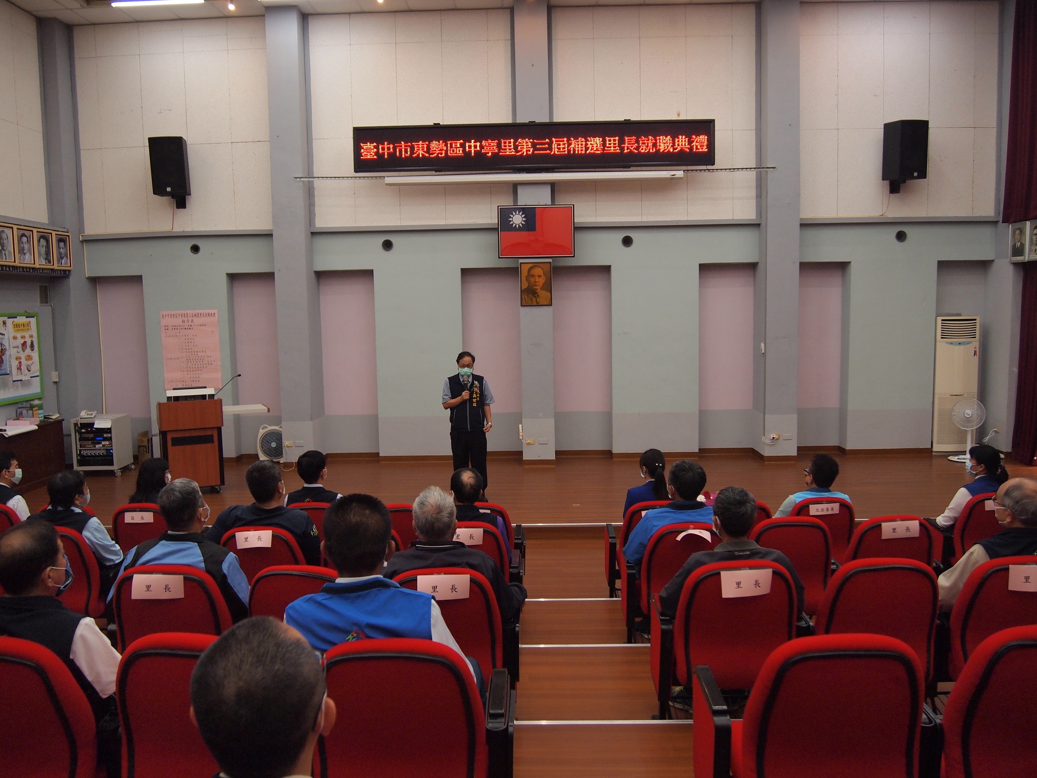 台中市東勢區中寧里里長補選就職典禮今(27)日在東勢區公所舉行,由市府民政局長吳世瑋頒發當選證書、印信並致贈市長盧秀燕「勤政親民」匾額給新任里長廖蒙歆,期許廖蒙里長以其行銷管理專長延續前里長打下的基礎推展里政,了解里民需求,提供更優質的服務。