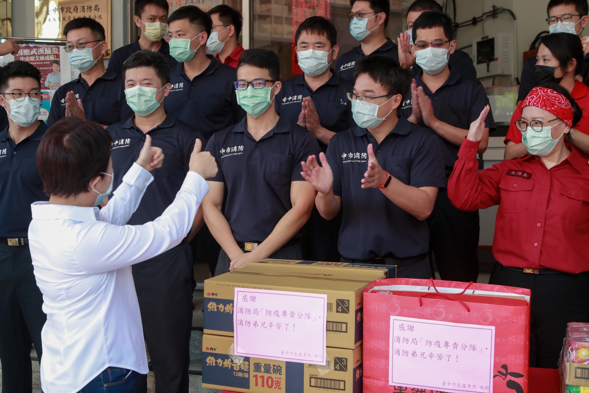 台中市消防人員除受理一般救護案件,今年1月22日起更組成「防疫專責分隊」,專責載送中市疑似新冠肺炎個案,送往收治醫院篩檢治療,截至目前已累計載送329案。市長盧秀燕今(29)日特別前往消防局第七救災救護大隊慰勞同仁,90度鞠躬並握住隊員的手說「各位同仁辛苦了,謝謝!」她強調,救災救護同仁平時做的都是「超人」任務,是守護城市的英雄!