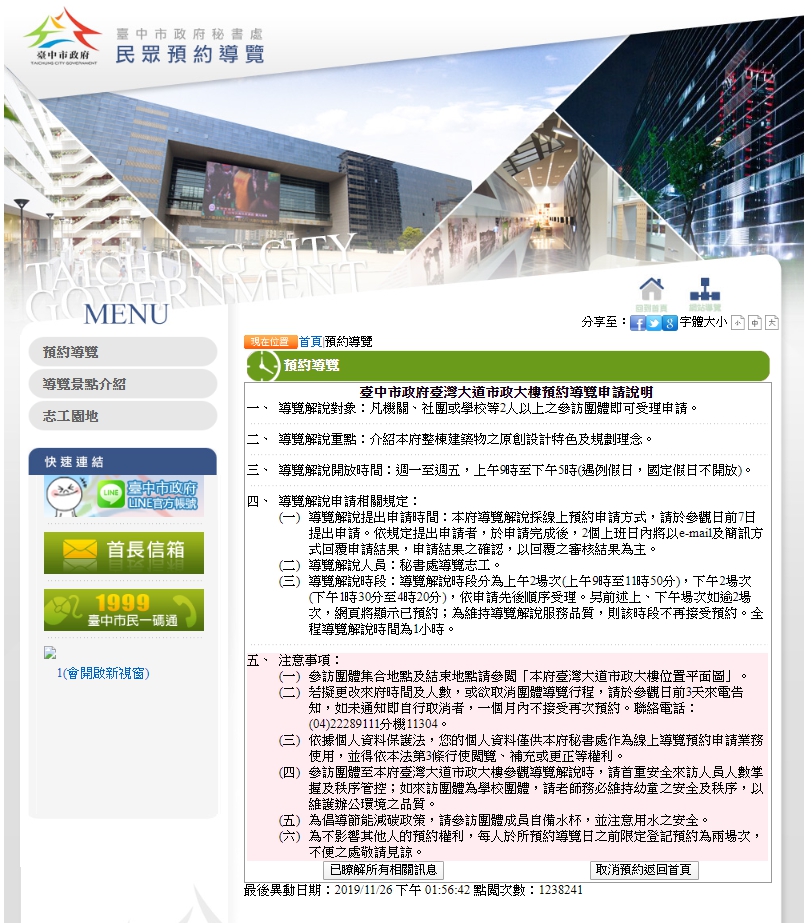 秘書處指出,為提供更貼近民眾需求的導覽服務,市府可提供客製化導覽內容與時間規劃,以迎合不同年齡層、不同屬性的參訪團體需要,有興趣的民眾可至網站 http://vols.secretariat.taichung.gov.tw 線上申請。(5/21*13)*秘書處