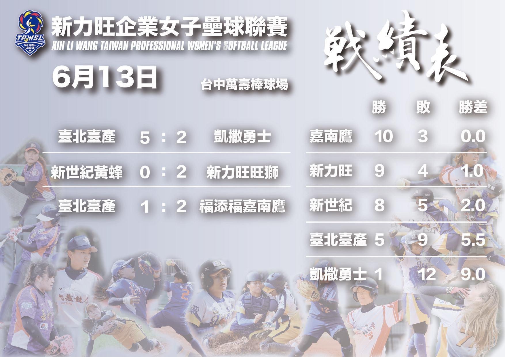 運動局表示,企業女壘聯賽4月25日起在台中萬壽棒球場開打,在防疫期間為球迷持續提供精采運動賽事,台中在地球隊新力旺旺獅昨(13)日險勝新世紀黃蜂,緊咬目前戰績第一的福添福嘉南鷹隊,僅一場勝差,戰況激烈。