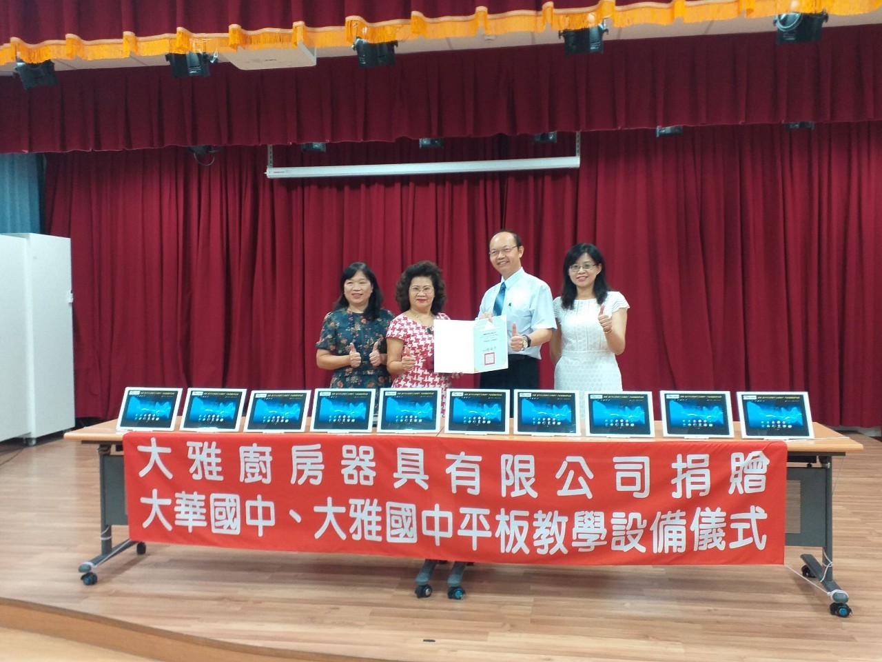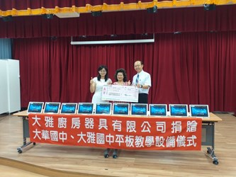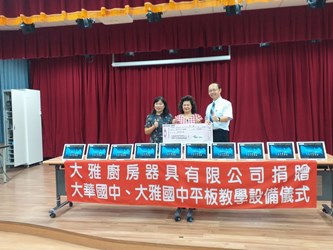 因應新冠肺炎疫情未來如導致停課情形,台中市政府呼籲各界踴躍捐贈平板電腦提供弱勢學生,大雅廚房器具有限公司響應政策,捐贈24萬元供大華國中及大雅國中購置教學設備。今(6)日在大華國中活動中心舉辦平板電腦捐贈儀式,教育局長楊振昇感謝各界支持,弭平數位學習落差。