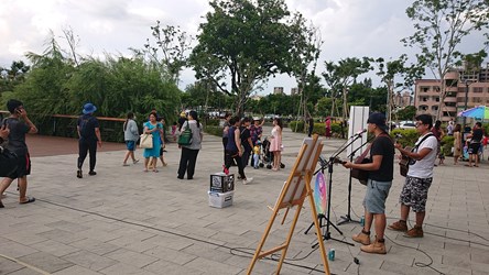 「街藝相挺 藝起加油」今晚在帝國糖廠正式揭開序幕,由在地街頭藝人河堤樂團及孔令嵩率先上場,文化局副局長施純福也到場支持