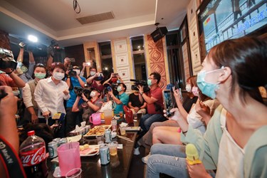 今日首日專案查察,盧市長逐一到包廂查察民眾戴口罩情形,當中有一群大學生來慶生唱歌,在包廂中歡樂高歌也有配戴口罩,民眾表示有看到市政府的呼籲,所以是自備口罩來唱歌,包括入內消費要登記實聯制都能配合,保護自己也保護他人。盧市長則回應,感謝市民朋友的配合,防疫拉緊是為了讓民眾安全更有保障「生活放輕鬆,防疫不放鬆」,最後也祝賀三位民眾生日快樂。