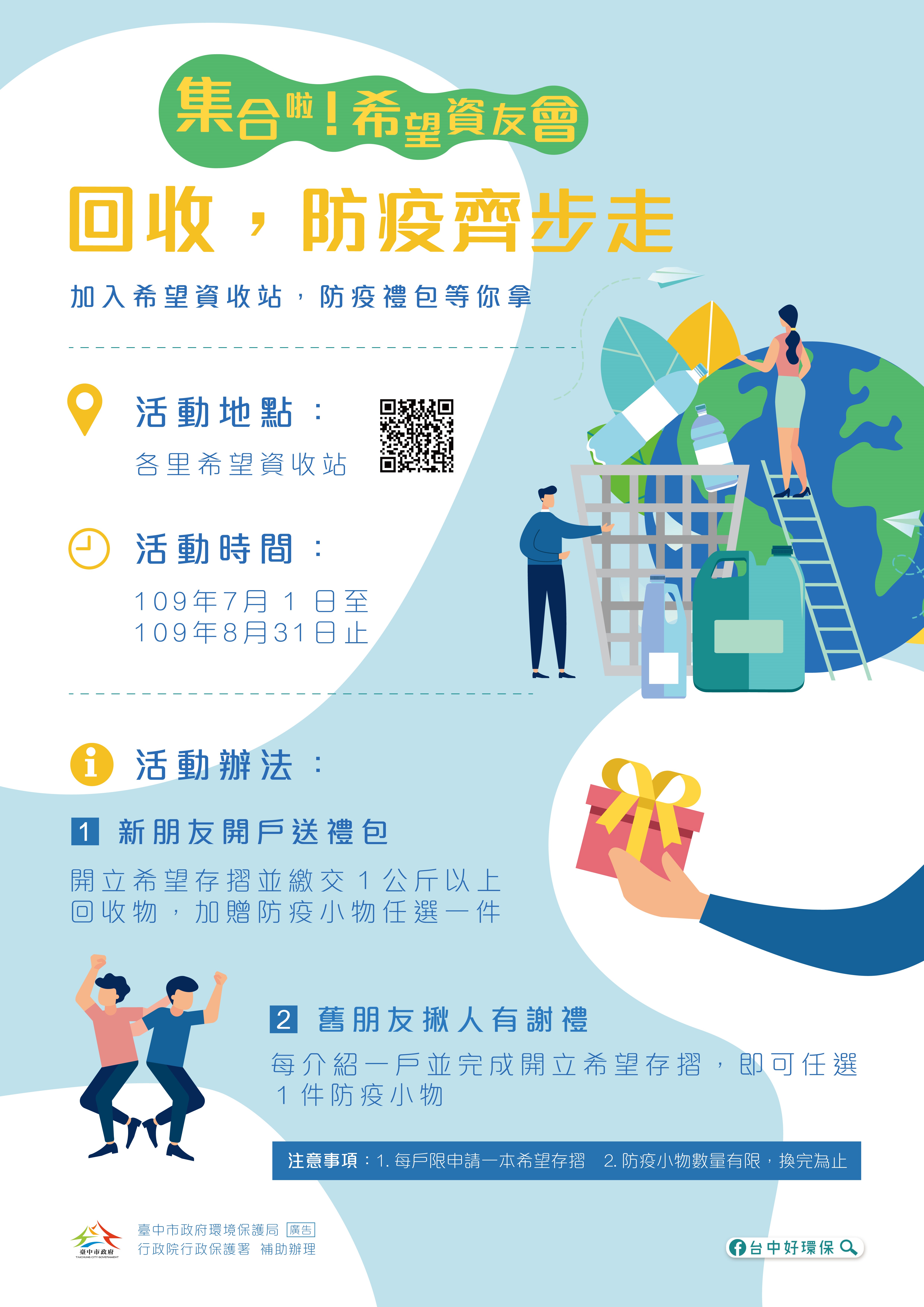 資源回收賺好康!因應新冠肺炎防疫,台中市政府環保局今年舉辦「集合啦!希望資友會,回收、防疫齊步走」活動,鼓勵民眾回收集點換生活用品,即日起至今年8月31日止,只要新朋友開立「希望存摺」並繳交1公斤以上回收物,或舊朋友揪人開立,即可獲得1份防疫小物,數量有限,換完為止,歡迎民眾踴躍加入資收行列。