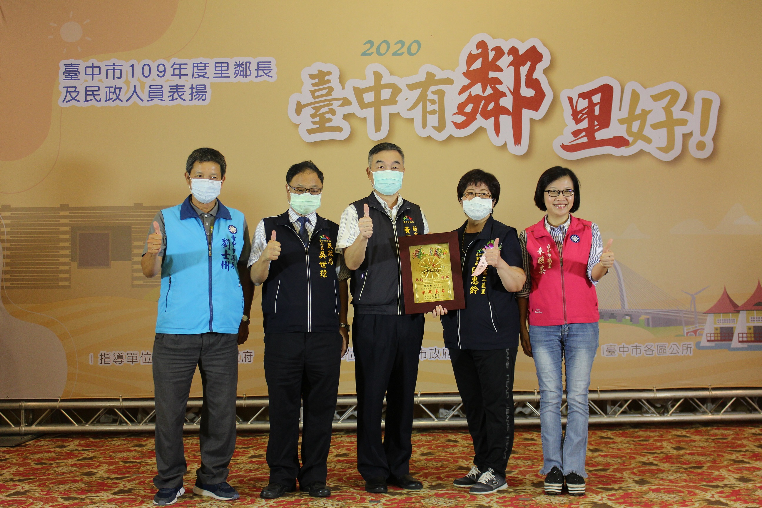 今日表揚活動包括黃副市長、民政局長吳世瑋、立法委員張廖萬堅、市議員劉士州、朱暖英、何文海、林德宇、張耀中,以及多位里鄰長皆出席同歡。
