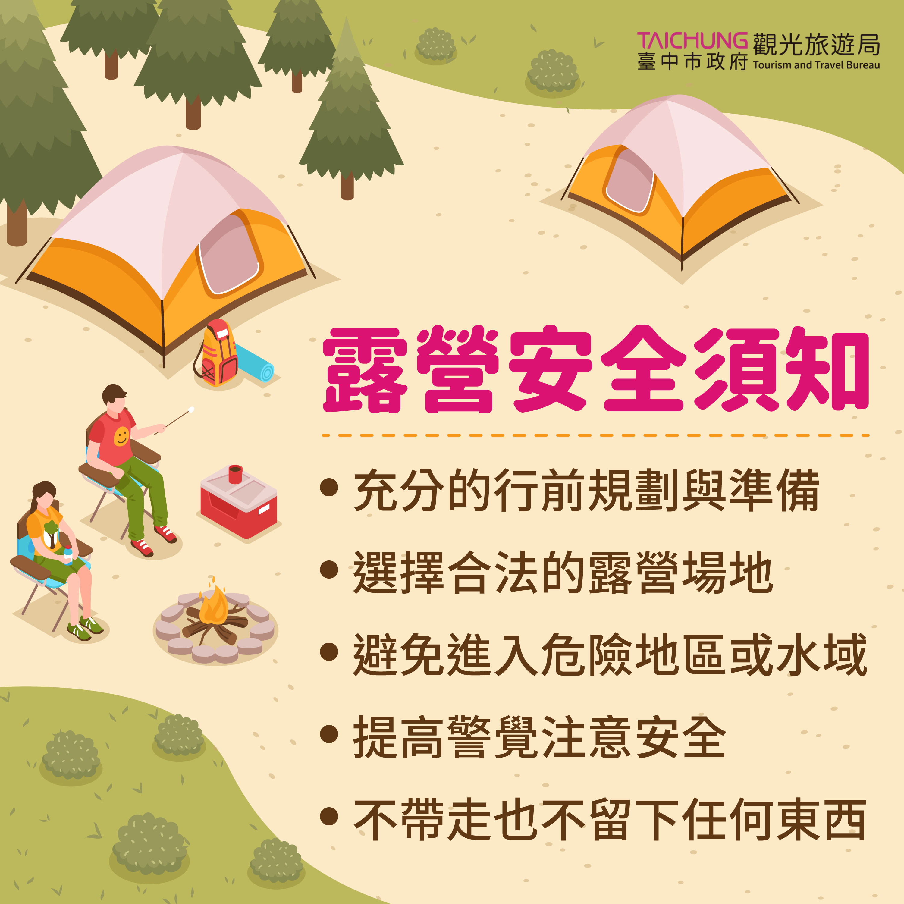台中市合法露營場名單及露營地圖,請至台中市政府觀光旅遊局官網查詢(網址https://www.tourism.taichung.gov.tw/1205076/post ),再次呼籲民眾為自身安全,請勿至未合法或危險山邊溪谷河床水域等地點露營,以防坡地坍蹋及洪水瀑漲等風險。(9/14*8)*觀光旅遊局