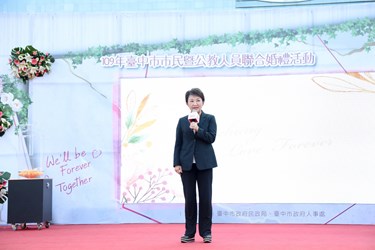 盧市長說明,今年受新冠肺炎疫情影響,市府為保險起見,等到較安全的時刻舉行此次聯合婚禮,感謝新人們耐心等待,並獻上智慧萬用鍋、電鬍刀、音波震動牙刷、吹風機成家好禮家電四件組及迷你助孕金鏟,強調台中市養育兒女費用僅占家庭支出8%,是六都之中最低的城市,祝在場新人早生貴子,踴躍使用0至6歲不排富育兒津貼等各項措施。
