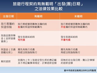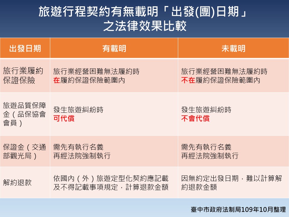 其中,市府針對今年7月及9月的2場台中旅展,均派員到場抽查,發現有旅行社預售未載明出發日期的國內外旅遊行程;也有旅宿業者販售未記載入住日期的住宿訂購單,這些旅遊、住宿商品未提供履約保證機制,也非中華民國旅遊品質保障協會的保障範圍,商品風險較高,已通知主管機關命業者限期改善。