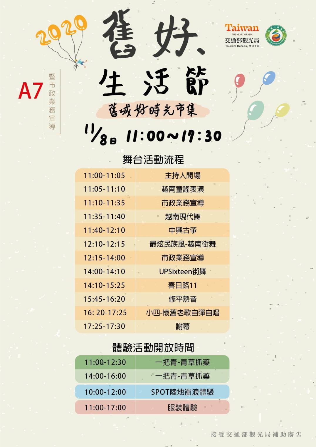 觀旅局表示,中區入選今年交通部觀光局經典小鎮之列,除三代台中火車站共存外,更擁有綠川水岸廊道、柳川水岸步道、台中第二市場、東協廣場、萬春宮等知名景點,中區公所將於明(7)日至8日,在柳川藍帶水岸推出「舊好生活節X舊城好時光市集」,活動包括服裝體驗、SPOT陸地衝浪、野餐、老屋歷史特展、DIY老屋建造體驗及青草抓藥體驗等,邀請多間在地私房美食店家,現場設置小木桌及野餐墊,趁機更貼近中區的脈動。