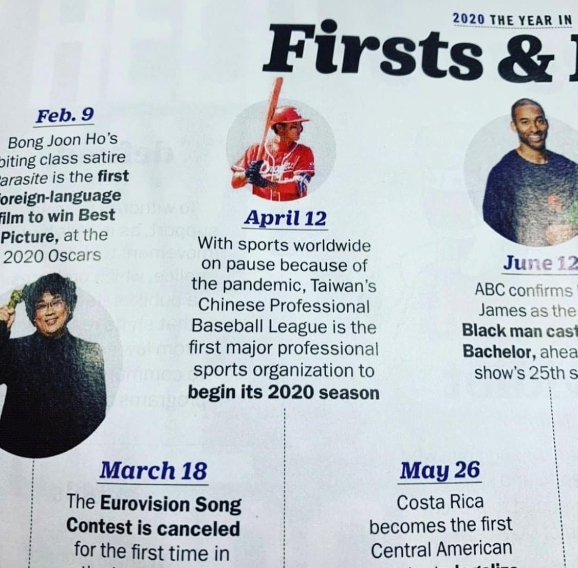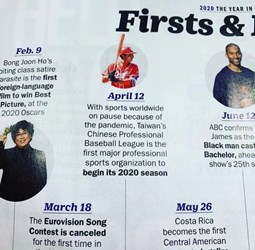 全球各職業運動賽事因新冠肺炎疫情延期或停辦,台中獨步全球舉辦中華職棒等賽事獲得世界棒壘球總會(WBSC)專文報導,近日再登上最新一期《時代雜誌》(《Time》),評選為2020年度大事「最初與最後」里程碑,肯定中華職棒大聯盟及台中的中信兄弟主場洲際棒球場,成為國際首場開放球迷入場觀賽的體育聯盟,引起全世界體育迷關注,更讚賞台中防疫有成,讓球迷能夠享受精彩賽事。