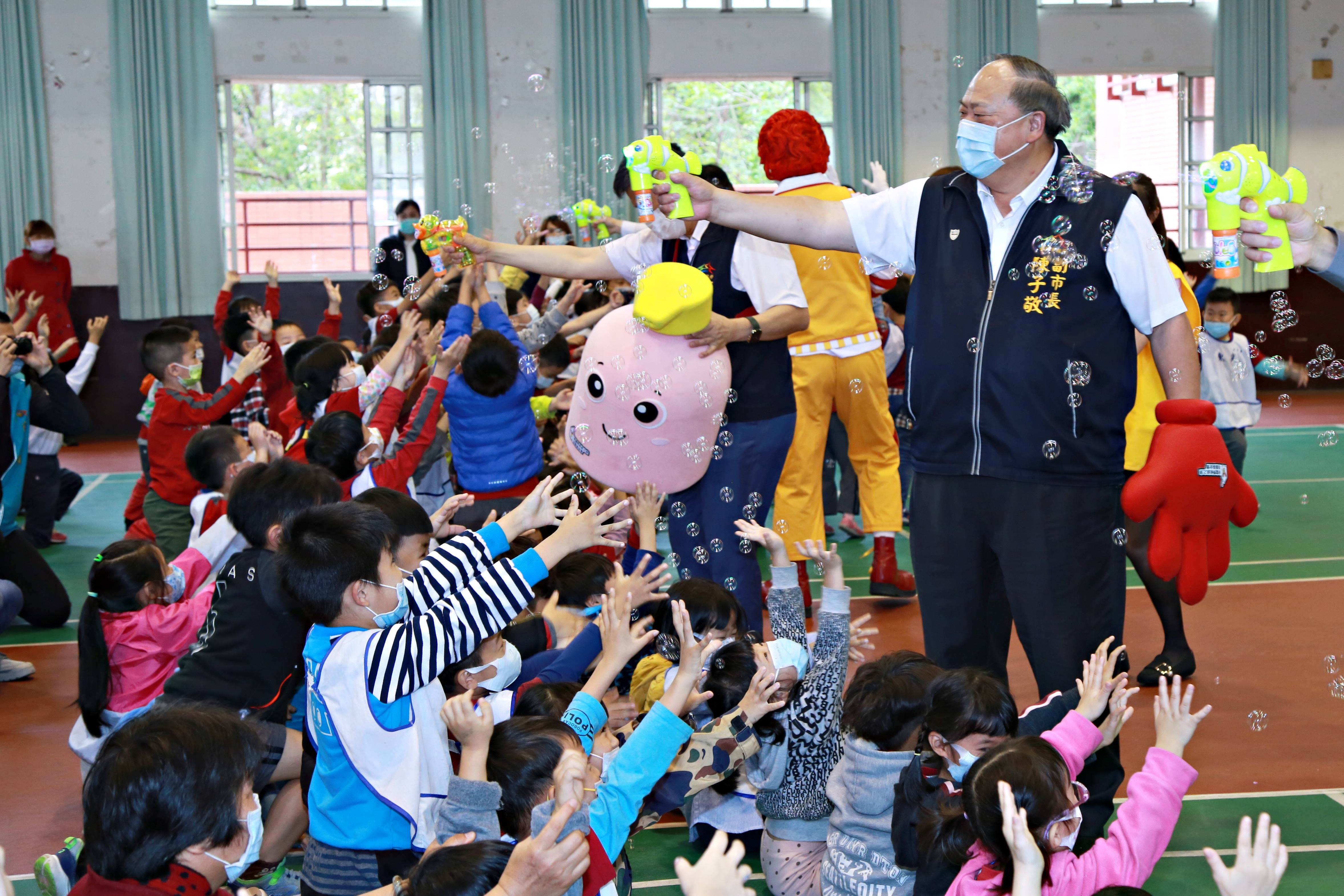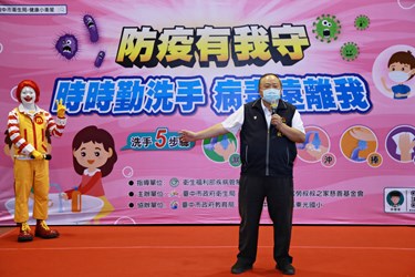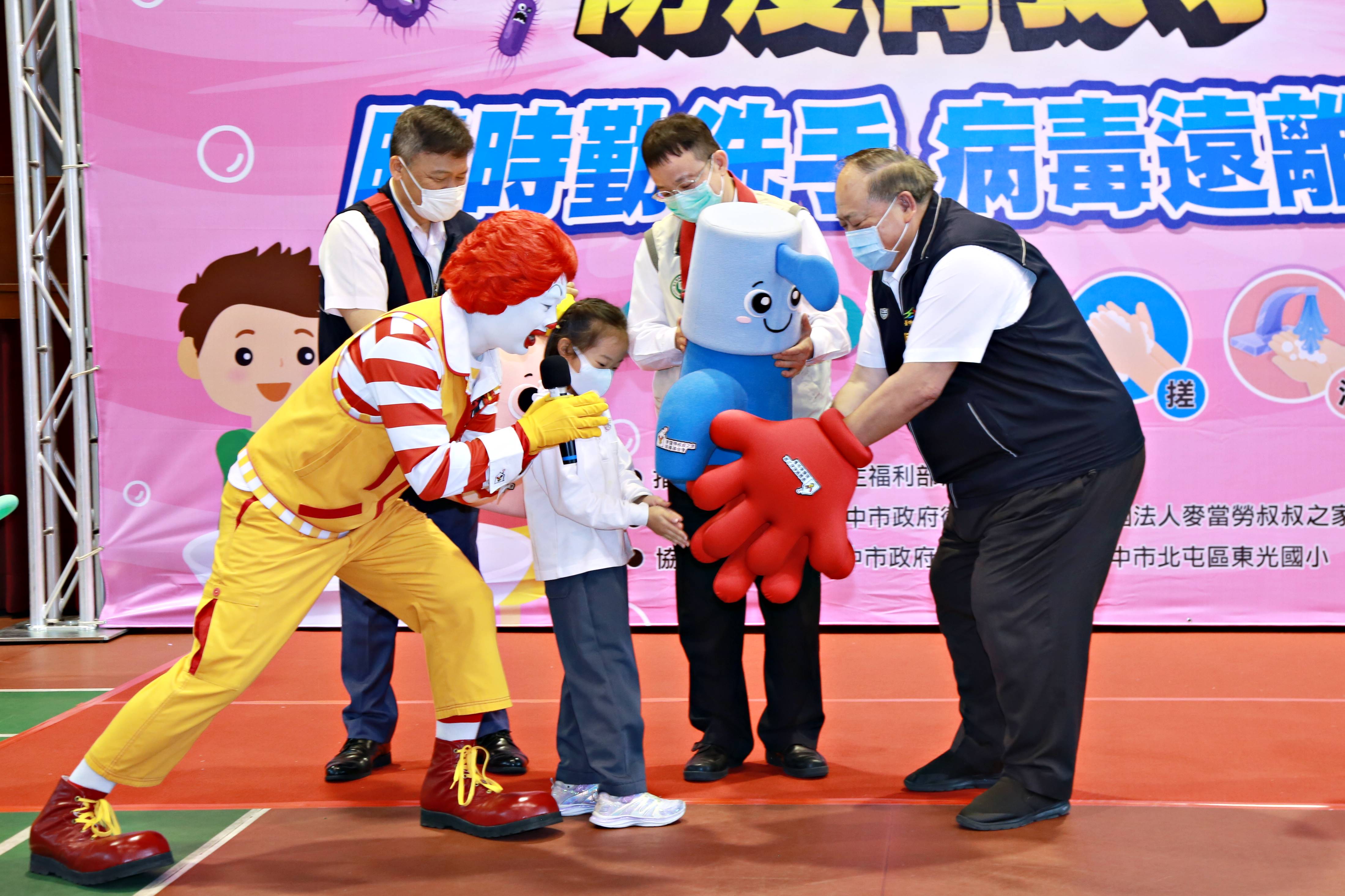 今日活動現場由麥當勞叔叔透過洗手歌帶動唱及遊戲,教導小朋友正確洗手及佩戴口罩,才能有效預防腸病毒及新冠肺炎侵襲;副市長陳子敬、衛生局長曾梓展、疾病管制署中區管制中心主任吳智文、台中市議員黃健豪、教育局專門委員郭明洲及北屯區長歐陽明等人皆出席,市議員沈佑蓮、陳成添、曾朝榮及謝明源派員關心。(4/9*11)*衛生局
