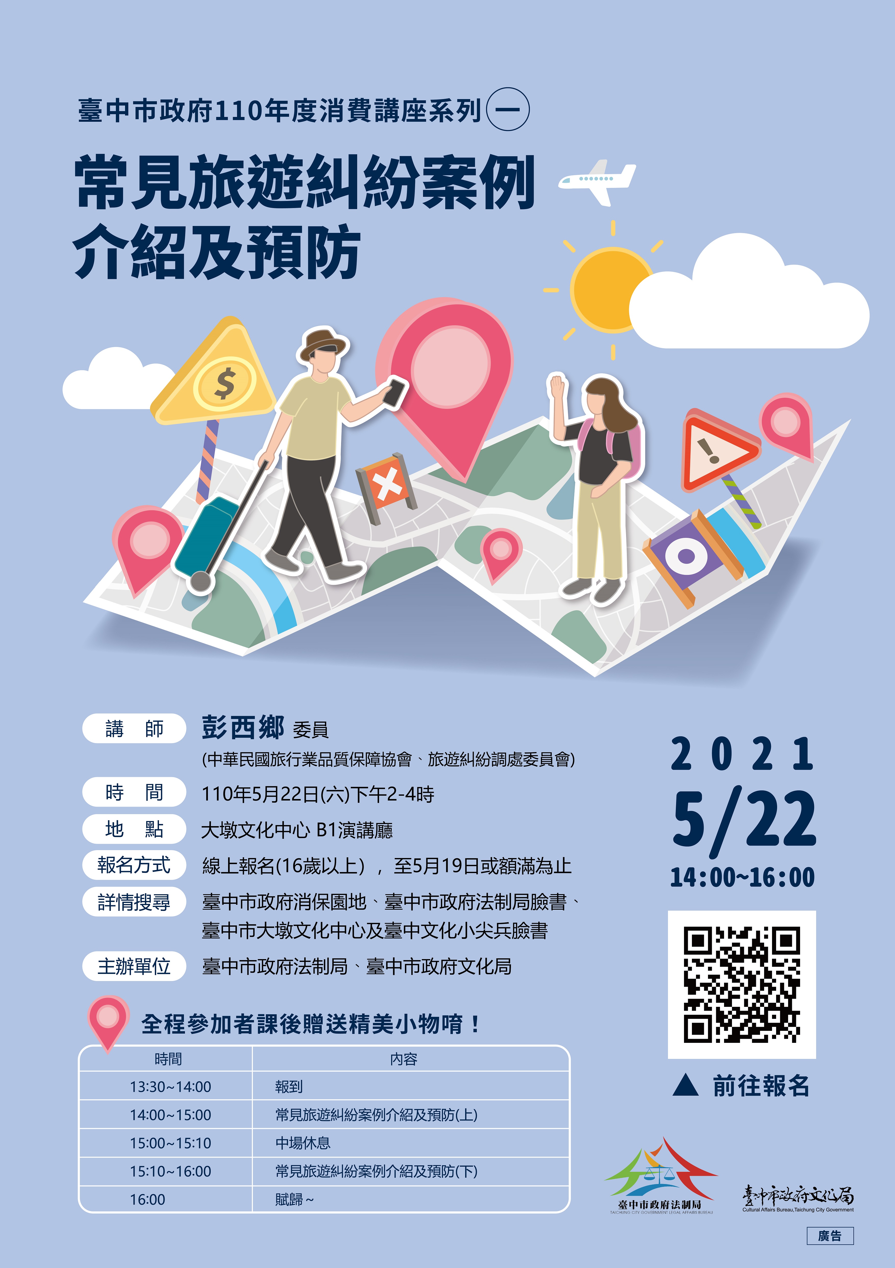 「常見旅遊糾紛案例介紹及預防課程」自即日起開放報名至5月19日止(線上報名網址https://forms.gle/pcRAy6LPYPsSVQKD8)。相關報名資訊刊載於臺中市政府消費者保護園地網站、臺中市政府法制局臉書及文化局與大墩文化中心臉書,歡迎民眾踴躍參加。16歲以上民眾預先報名成功並全程上課,課後還可獲精美小禮物1份!要請民眾注意的是,因防疫考量,本次課程採實名制並僅開放線上報名,但法制局將於課程當日,同步在法制局臉書進行線上直播,讓無法到場參加的朋友,也能獲得最完整的消費資訊。