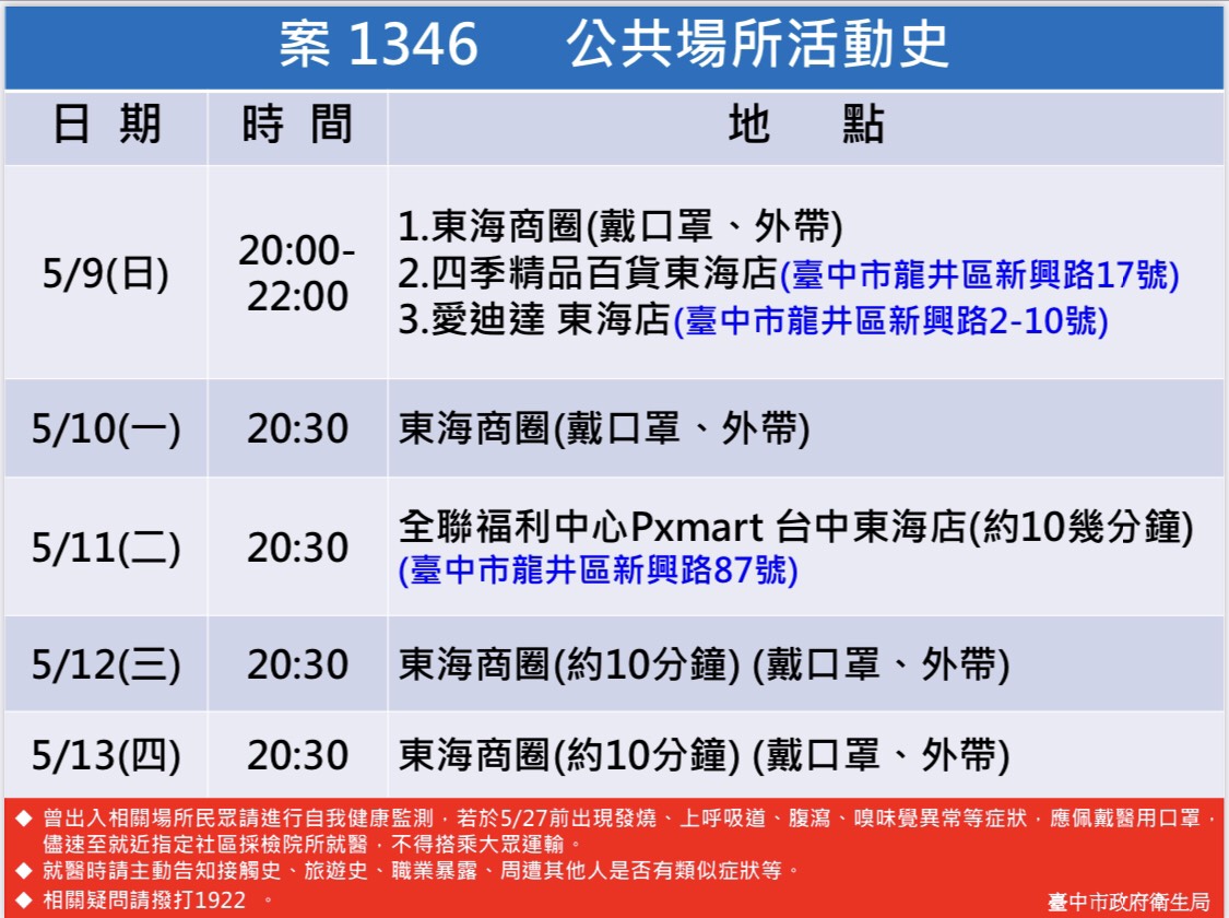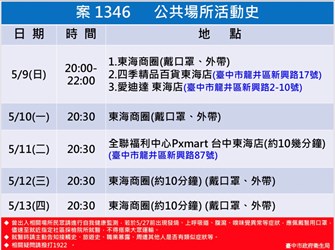 針對個案所涉足跡,曾局長說明,個案5月9日20時至22時間曾至東海商圈買晚餐、四季精品百貨東海店及愛迪達東海店;10日20時30分於東海商圈買晚餐後返回租屋處;11日20時30分前往全聯福利中心台中東海店,停留約10幾分鐘;12日、13日20時30分於東海商圈買晚餐後返回租屋處。