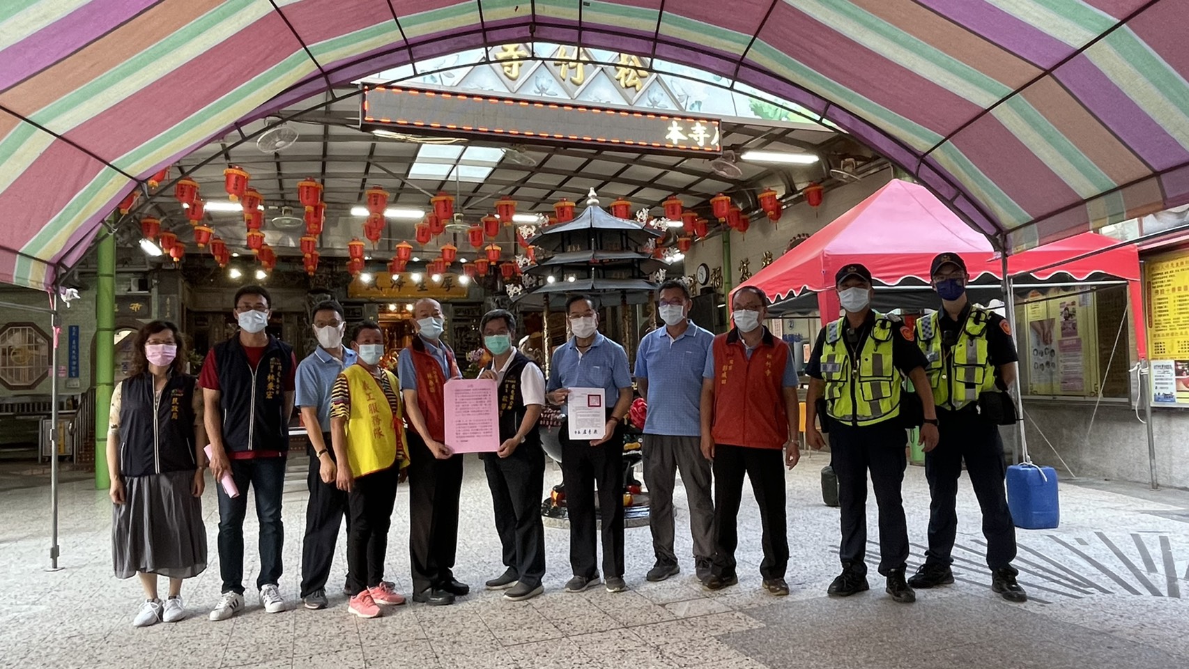 國內新冠肺炎疫情急遽升溫,內政部昨(15)日晚間宣布,全國各寺廟及宗教相關場所,至6月8日前「不開放入內」參拜,民眾僅可於「廟埕」或「室外符合社交距離」前提下,且須採「實聯制、佩戴口罩」進行參拜。台中市政府民政局配合落實防疫,透過各區公所協力宣導,團結抗疫,做好防疫挺台灣。