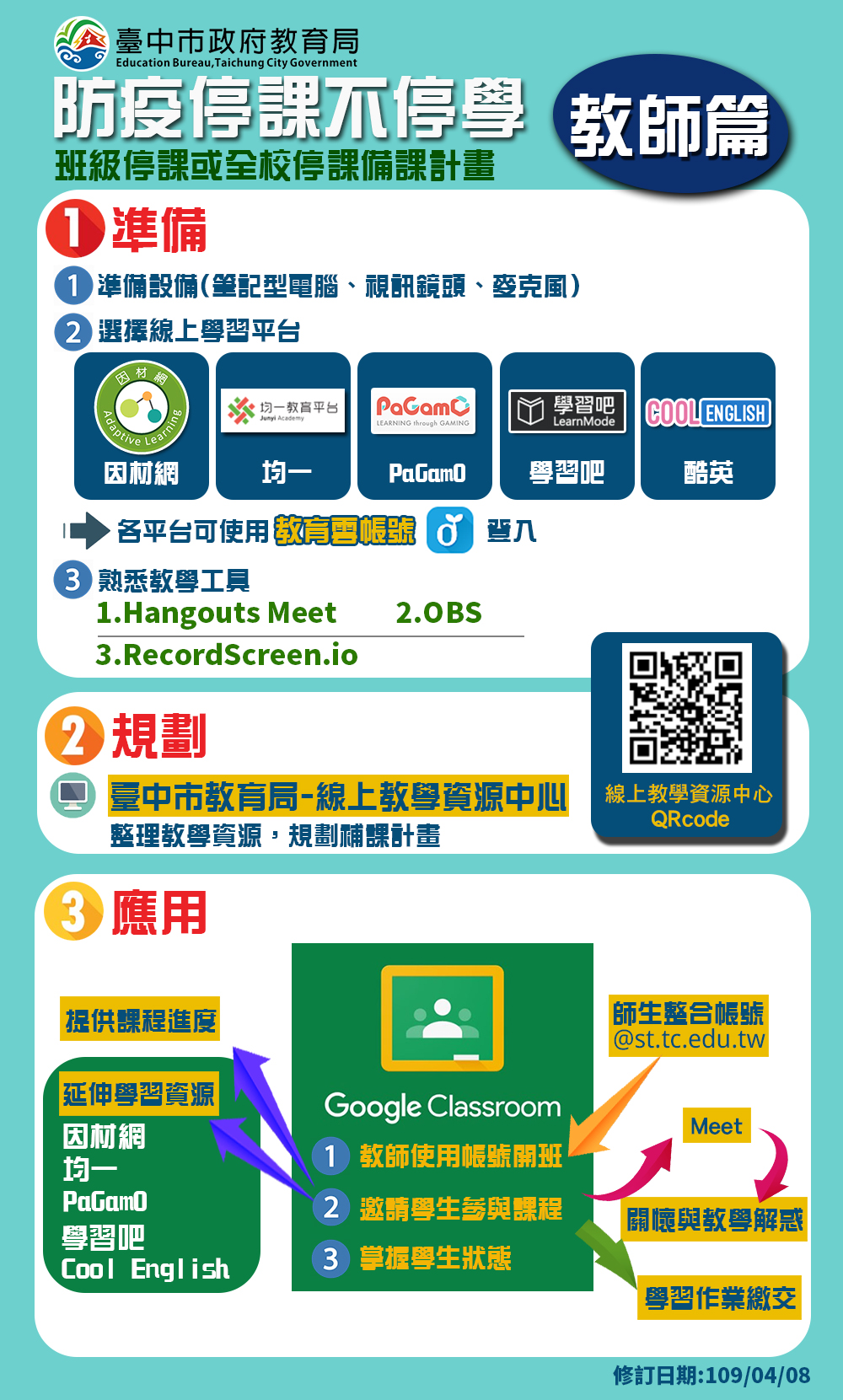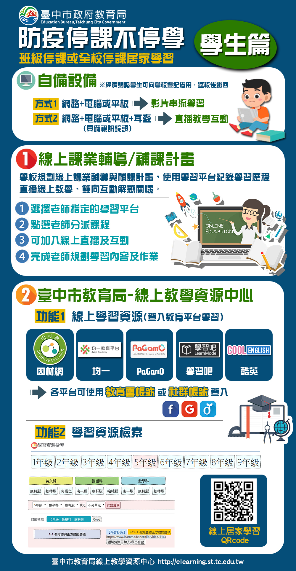 教育局長楊振昇說明,台中市各級學校已完成線上教學模擬演練,國三及高三停止上課,學生仍能依據課程計劃學習,教育局並建置「台中市線上教學資源平台」,整合1萬餘筆1至12年級各科各版本的學習影片及補充教材,另備有行動載具及行動網卡供經濟弱勢的學生免費借用,避免學生因疫情停課造成學習中斷。