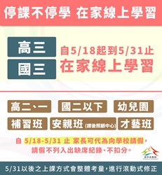 另針對國三、高三停課後,少數須辦理重補修取得畢業資格者,可於6月1日起返校進行重補修,或採行調整占分比率等多元方式處理。本學期延後開學,國三課務在會考後遺留的課務可於線上完成,期末評量補行評量可利用線上繳交報告等多元方式處理,維護學生權益。(5/17*18)*教育局