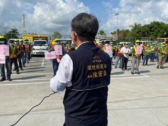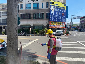 國內疫情升溫,為防止台中疫情擴散,台中市政府環保局防疫消毒大隊今(19)日再度動員11區清潔隊,總計百名消毒人力、22台背負式水霧機、12輛消毒車及3輛霧砲車,全面消毒大里區戶外公共環境。環保局長陳宏益除到場勉勵抗疫消毒作業弟兄,也再三叮嚀仔細消毒民眾易接觸地方,如候車亭座椅、扶手等,全力守護城市環境安全。