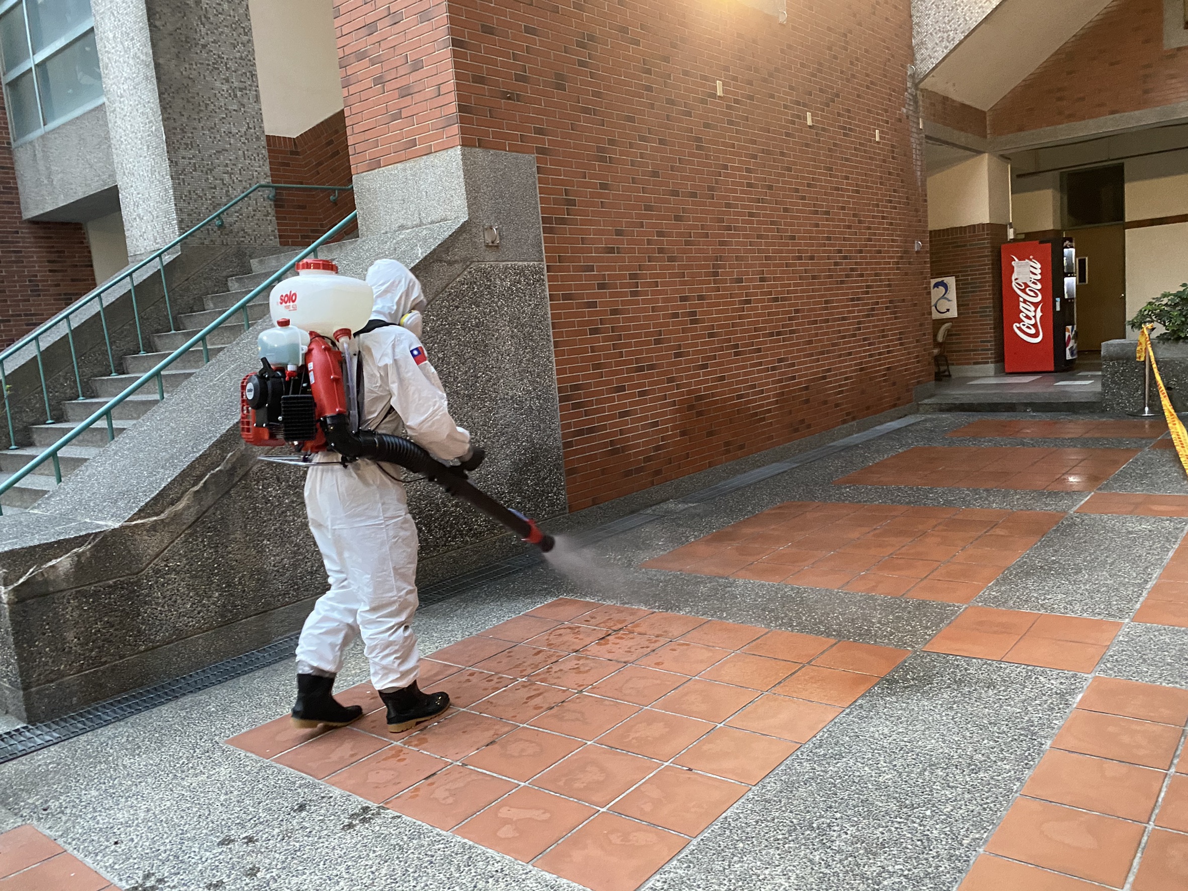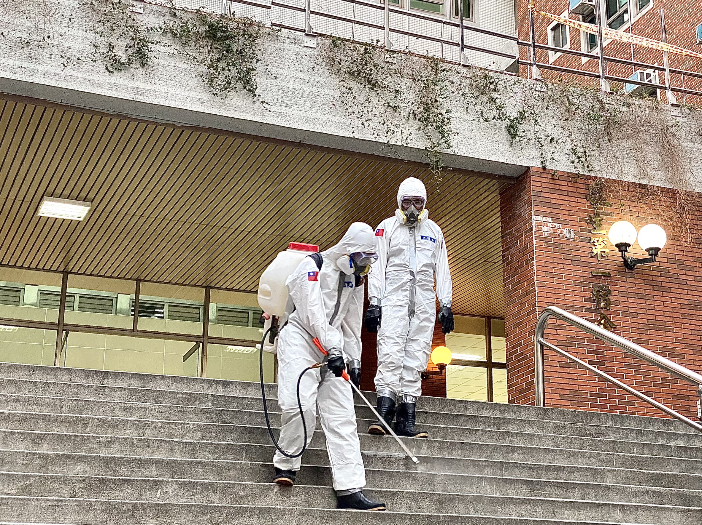 陸軍十軍團昨日派遣36化學兵群,包含15名官兵、6台背負式消毒器及中型戰術輪車等機具,由楊中校及黃中尉率隊,前進朝陽科大支援校園內部重點區域全面清消,範圍包括快篩站、教職員辦公區、教室、宿舍及餐廳等區域,從黃昏一直消毒到夜晚,每位官兵都盡可能地把每個角落都消毒乾淨,確保師生安全無虞。