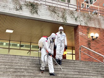 朝陽科大越南籍境外生阮同學指出,感謝環保局、學校及支援的國軍3天來徹底執行校園內外消毒作業,在這段疫情緊繃時刻,空氣中淡淡的漂白水味,是安心的味道。