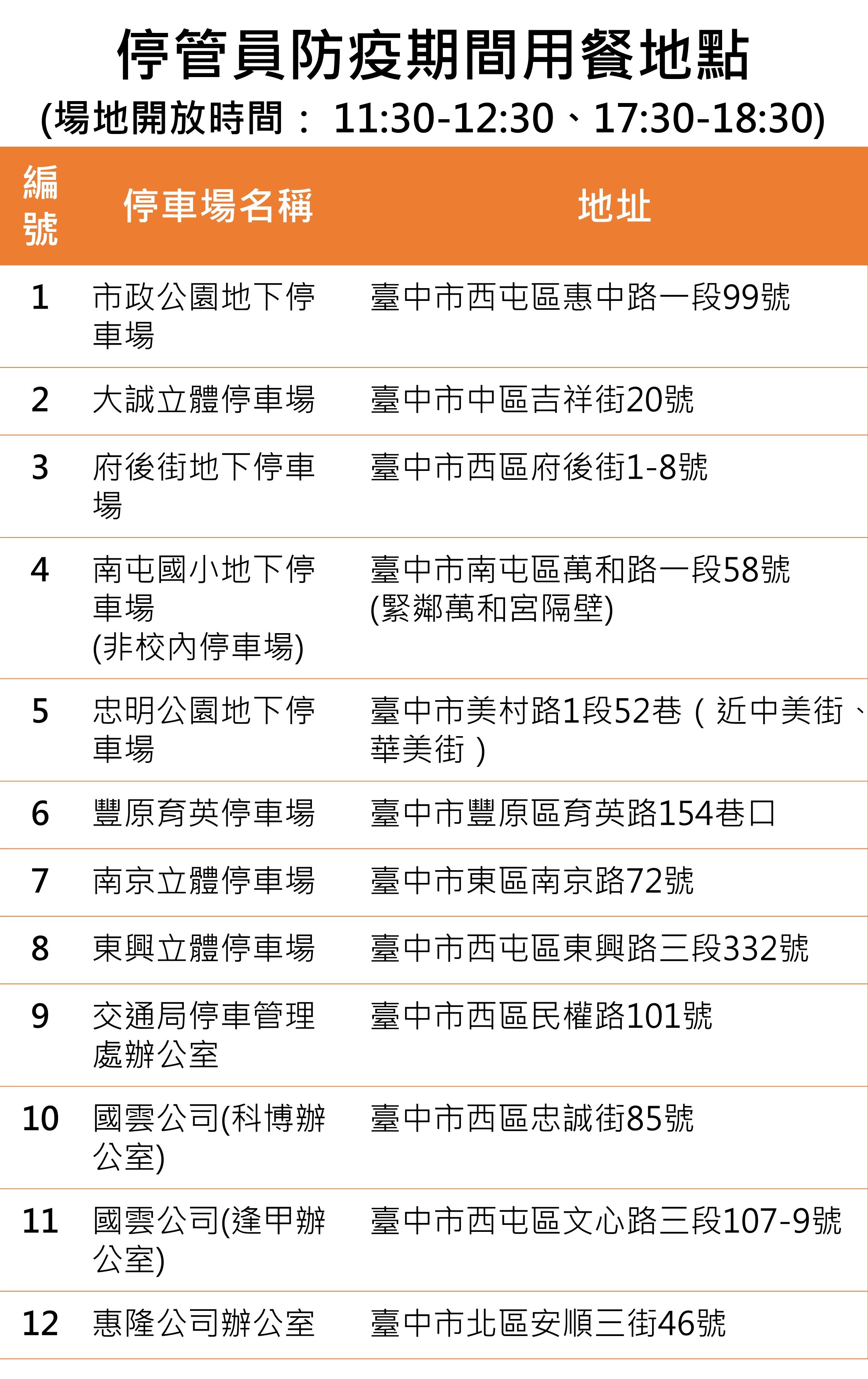 此外,交通局也延長停管員用餐休息時間至1個小時,並於每日上午1130分至1230分、下午530分至630分,於市政公園地下停車場、大誠立體停車場、府後街地下停車場、南屯國小地下停車場、忠明公園地下停車場、南京立體停車場、東興立體停車場、豐原育英停車場等處,在管理室內或旁邊試辦停管員用餐區,讓停管員於用餐時段購餐後可回到辦公室或就近至停車場用餐,市府後續再視成效滾動檢討。