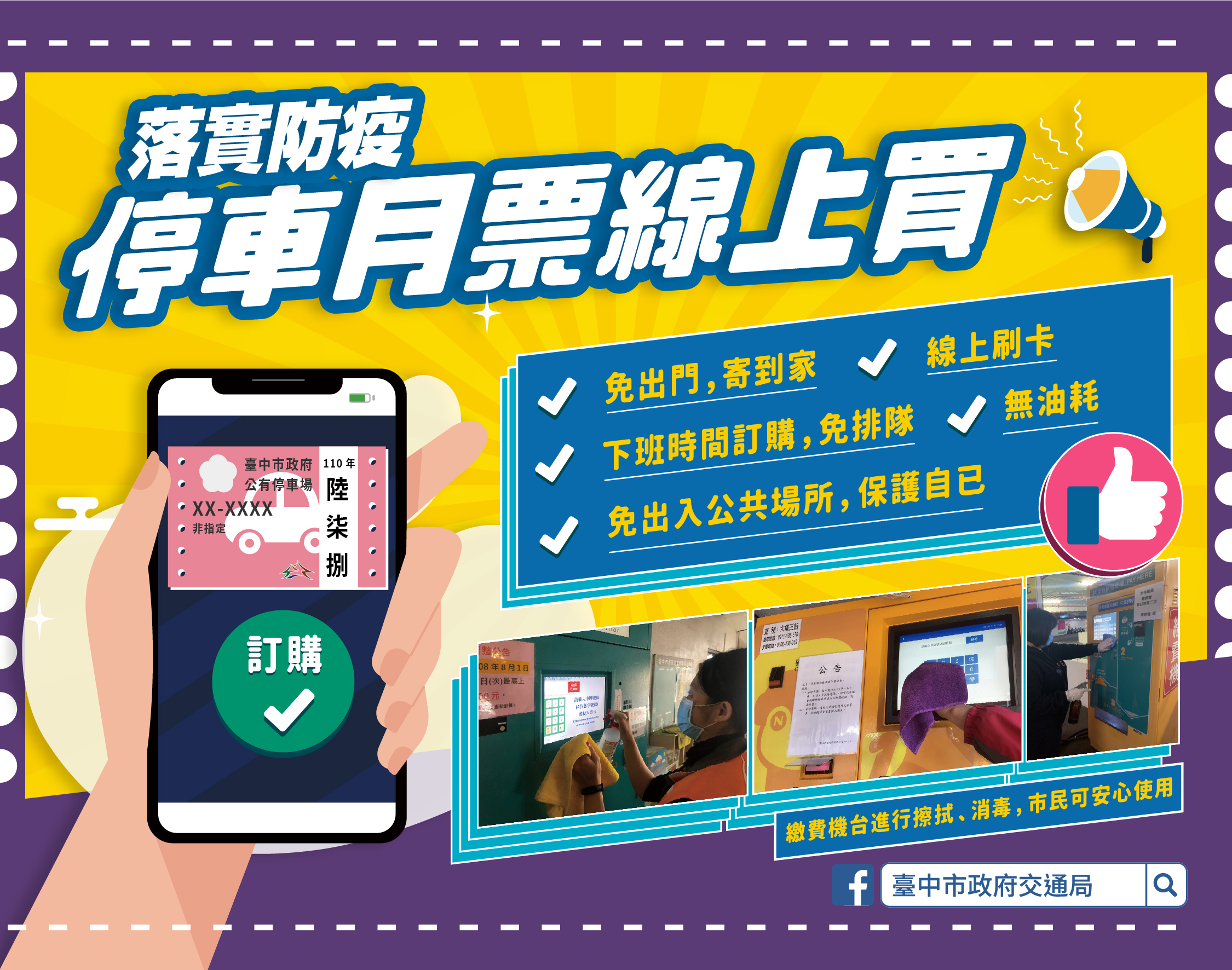 因應新冠肺炎疫情警戒提升至三級,台中市政府交通局持續落實公有停車場防疫措施,除每日清潔、消毒停車場域及設備,為兼顧防疫與工作人員飲食需求,特別設置防疫期間停車場用餐區,延長停管員用餐休息時間;另為擴大防疫工作,交通局已於520日起張貼簡訊實聯制QR code供民眾掃碼登記,積極推動線上購買月票等措施,共同為防疫努力。