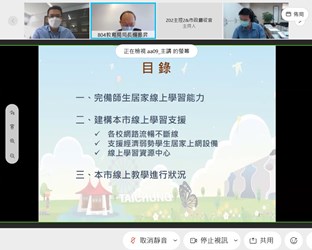 楊局長說明,教育局於去年3月起即建立班級平台及溝通群組、師生線上學習增能培訓,為完備師生居家線上學習能力,去年5月1至4日全國首創舉行大規模全市在家演練,涵蓋高中職、國中、國小師生,參與人數總計達16萬2,700人,學生參與率66%,教師參與率70%,教育部資科司也肯定台中市演練規模作為。