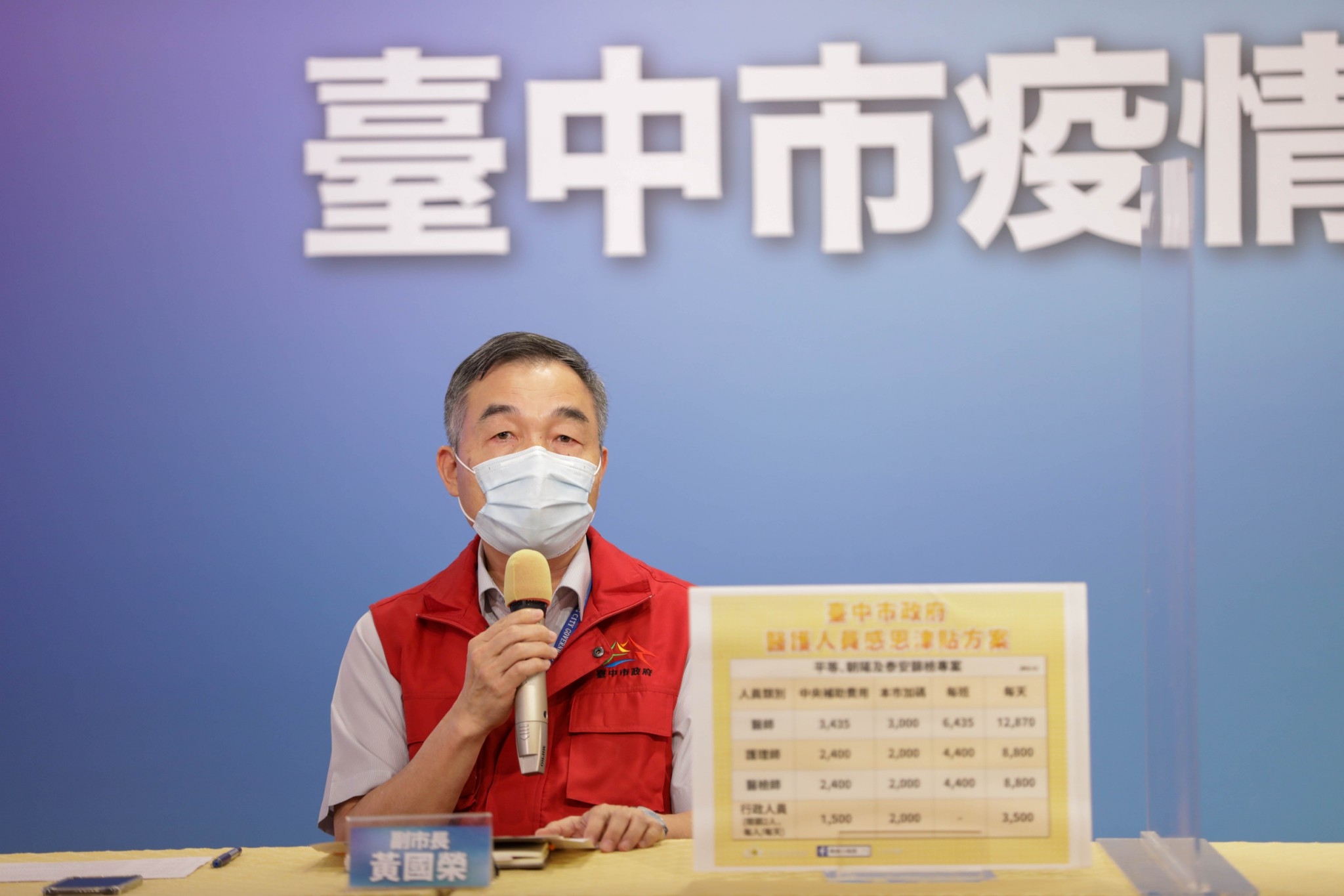 黃副市長進一步說明,針對和平區平等國小、朝陽科大、西屯區泰安國小等三處指揮所快篩站現役專案人員,市府自行籌措經費,額外發放感恩津貼,以醫師為例,台中市加碼每班3,000元,每班以4小時計,加上中央補助後金額為6,435元,1天做滿8小時最高可領取12,870元;護理師、醫檢師每班則加碼2,000元,加上中央補助後金額每班為4,400元,1天最高可領取8,800元;行政人員加上中央補助後金額則為每人每日3,500元。