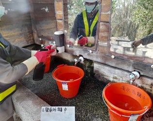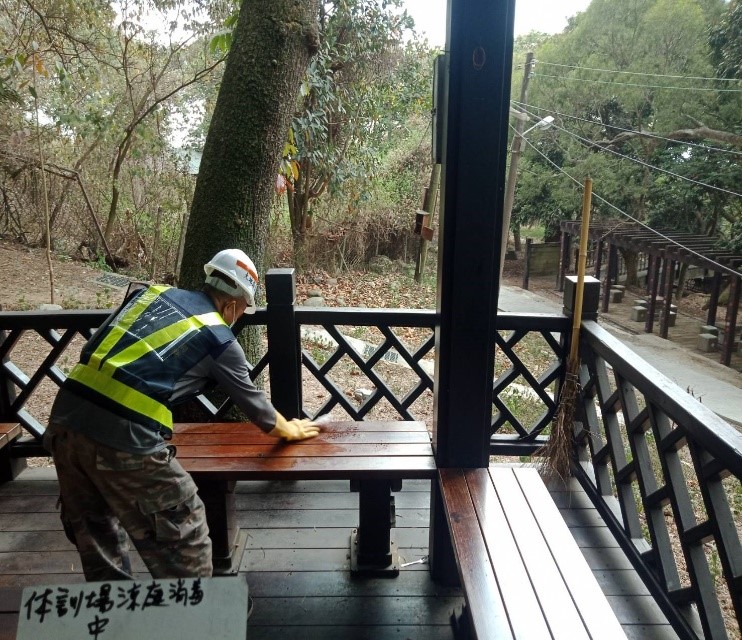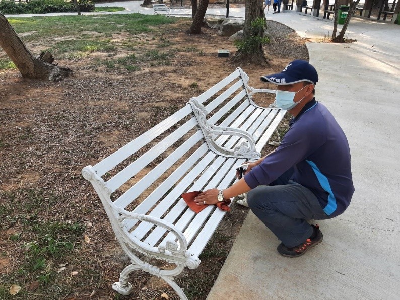 新冠肺炎疫情嚴峻,為落實防疫,台中市政府觀光旅遊局全面加強大坑風景特定區、大甲鐵砧山風景特定區各項服務設施防疫工作,風景區內的公共廁所、涼亭桌椅、遊憩設施及旅客易碰觸環境設施均利用稀釋漂白水消毒,全力守護民眾安全。