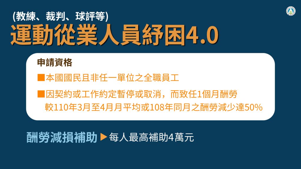 運動局提到,針對運動從業人員紓困,申請資格為我國國民且非任一單位的全職員工,因契約或工作約定暫停或取消,導致1個月酬勞較今年34月月平均,或108年同月酬勞減少5成即可申請,教育部將提供酬勞減損補助,每人最高補助4萬元。