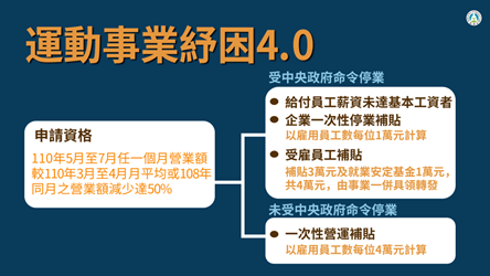 國內疫情爆發衝擊經濟,為加速紓困,教育部針對受影響而有營運困難的運動事業及相關從業人員,推出「運動紓困4.0」措施,補貼包括室(外)運動場館經營管理行業如球類運動場館、室內(外)游泳池、拳擊館、田徑場、健身中心及賽車場等運動事業,及符合資格的運動從業人員每人最高補助4萬元,自67日起至831日止線上受理申請。