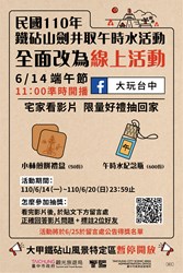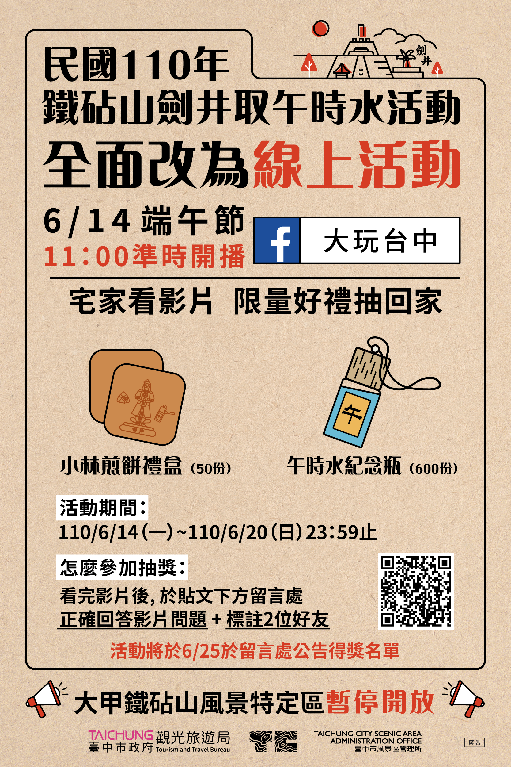 因應疫情嚴峻,台中市風景區管理所舉辦「鐵砧山劍井取午時水活動」全面改為線上參與,今(14)日端午節正式上線,趣味生動的動畫影片上午11時上架「大玩台中」臉書粉專,引起熱烈迴響,許多網友紛紛在活動貼文留言,熱情參與「看影片抽獎活動」,希望抽中劍井午時水紀念瓶,活動至6202359分截止,台中市政府觀光旅遊局邀請大小朋友,在家線上觀看大甲鐵砧山劍井午時水故事影片,認識端午節民俗文化,感受節慶氣息,還有機會抽到限量午時水紀念瓶,安心防疫又祈福。