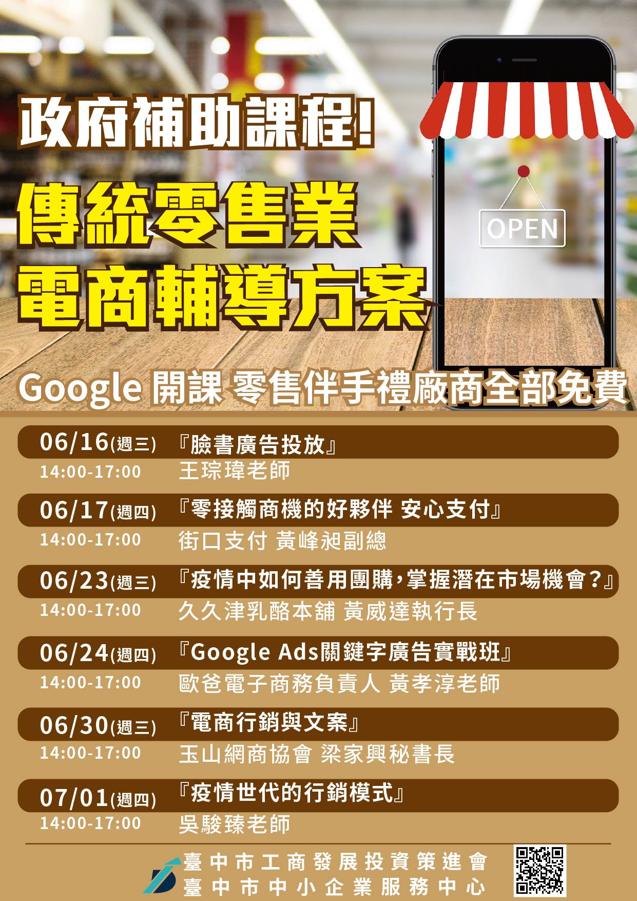 工策會說明,「傳統零售業電商輔導方案」系列線上課程,自明日起至71日,於每週三、四下午2時至5時舉辦,每堂課程3小時,共計18小時,透過Google meet軟體進行線上視訊教學,課程完全免費,期盼輔導在地業者於疫情期間能學習並善用數位工具,增加自身品牌的競爭力。