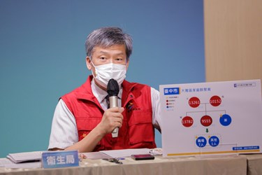 衛生局長曾梓展說明今日確診案例疫調情形,台中今日新增2例本土確診案,1例為霧峰快炒店群聚案,至今已累計7例;另1例為大雅區家庭群聚案,至今已累計4例。