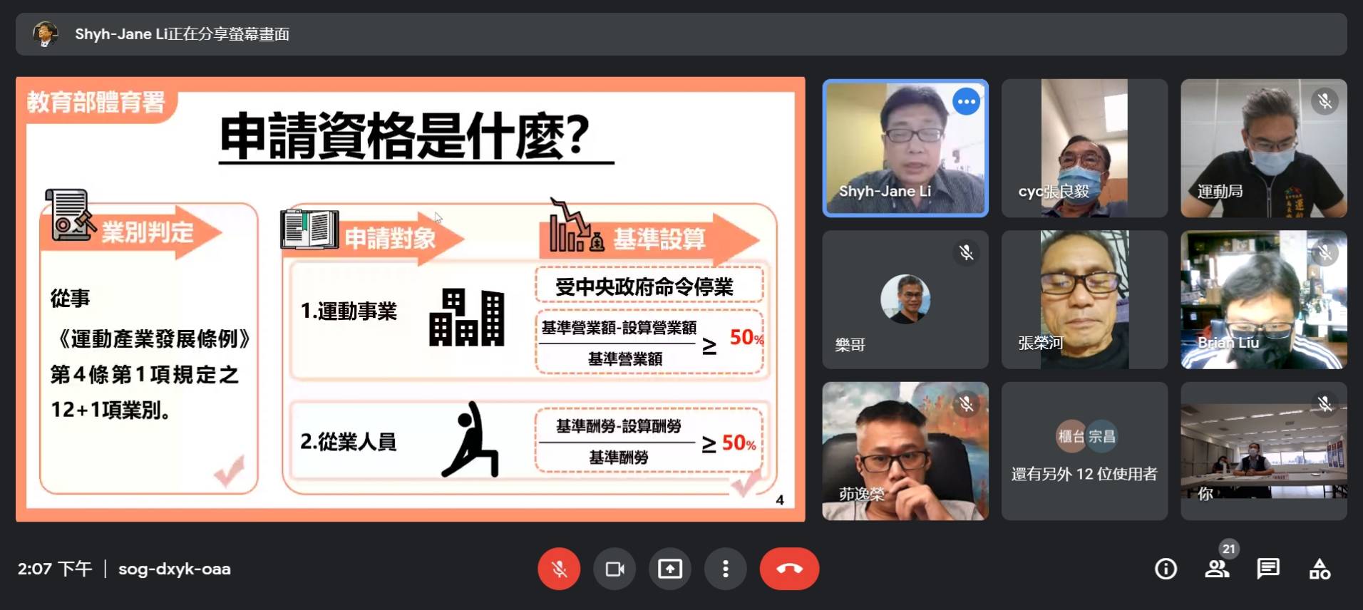 運動局長李昱叡表示,自三級警戒防疫以來運動產業,如健身中心等,配合中央防疫政策暫停開放,感謝業者共體時艱,市府也積極協助運動事業及從業人員申請中央紓困補助,率其他縣市政府之先,主動邀集運動產業與體育署共同舉辦線上說明會。